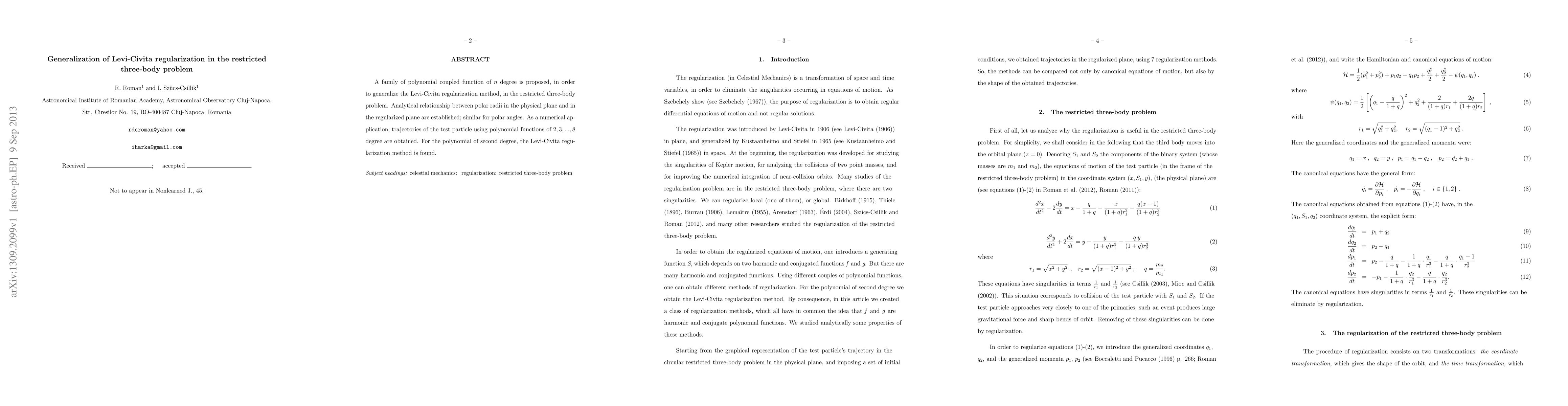 This paper proposes a family of polynomial functions to generalize Levi-Civita regularization in the restricted three-body problem, establishing analytical relationships between polar coordinates in physical and regularized planes. Numerical results show trajectories of test particles using polynomials of degrees 2 to 8, confirming the effectiveness of the second-degree polynomial.
