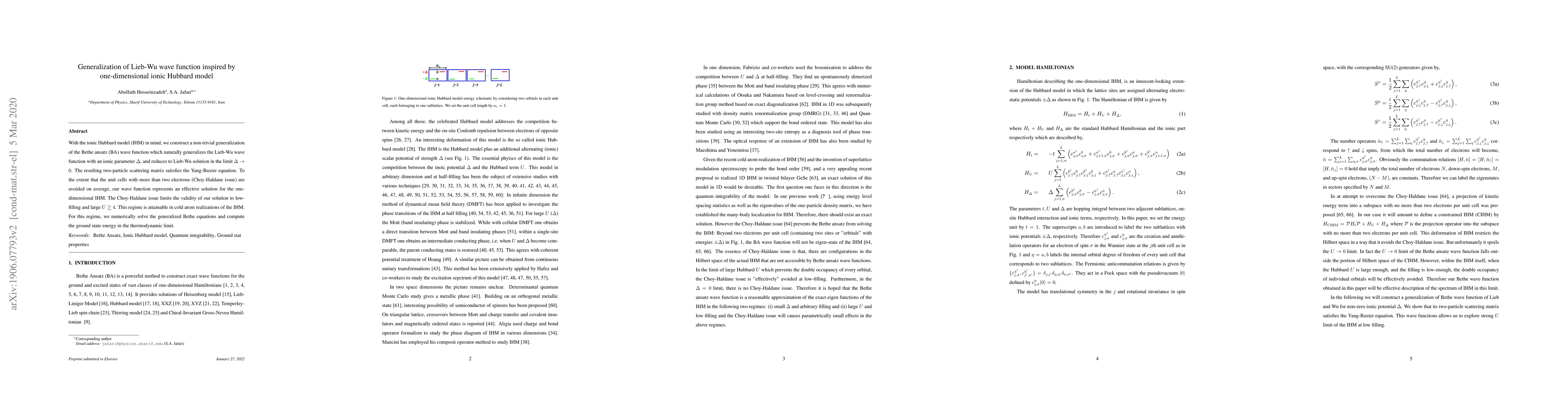 With the ionic Hubbard model (IHM) in mind, we construct a non-trivial generalization of the Bethe ansatz (BA) wave function which naturally generalizes the Lieb-Wu wave function with an ionic parameter $\Delta$, and reduces to Lieb-Wu solution in the limit $\Delta\to 0$. The resulting two-particle scattering matrix satisfies the Yang-Baxter equation. To the extent that the unit cells with more than two electrons (Choy-Haldane issue) are avoided on average, our wave function represents an effective soluiton for the one-dimensional IHM. The Choy-Haldane issue restricts the validity of our solution to low-filling and large $U\gtrsim 4$. This regime is attainable in cold atom realizations of the IHM. For this regime, we numerically solve the generalized Bethe equations and compute the ground state energy in the thermodynamic limit.
