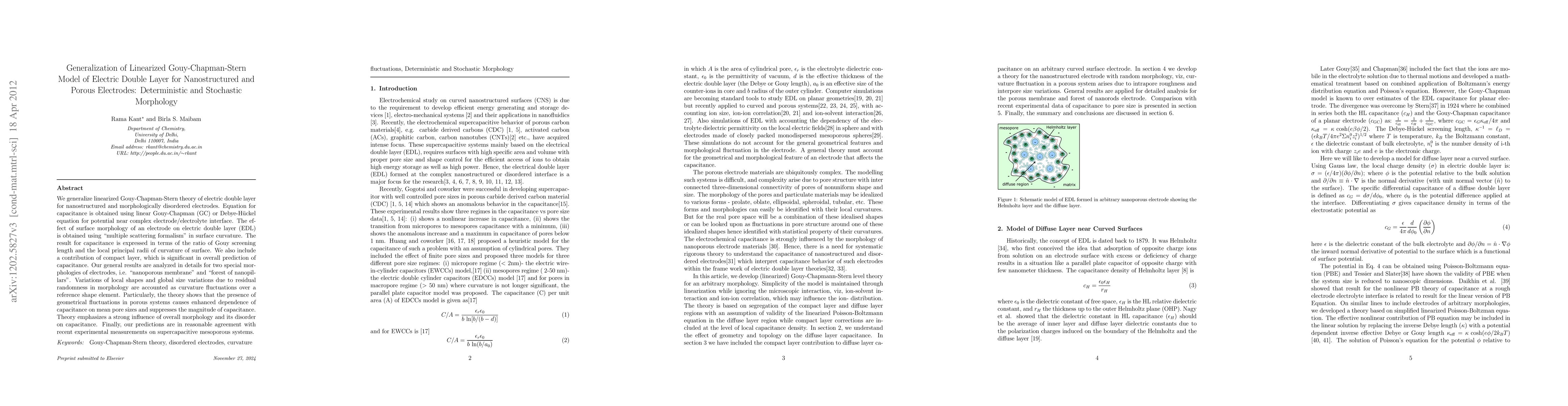 We generalize linearized Gouy-Chapman-Stern theory of electric double layer for nanostructured and morphologically disordered electrodes. Equation for capacitance is obtained using linear Gouy-Chapman (GC) or Debye-$\rm{\ddot{u}}$ckel equation for potential near complex electrode/electrolyte interface. The effect of surface morphology of an electrode on electric double layer (EDL) is obtained using "multiple scattering formalism" in surface curvature. The result for capacitance is expressed in terms of the ratio of Gouy screening length and the local principal radii of curvature of surface. We also include a contribution of compact layer, which is significant in overall prediction of capacitance. Our general results are analyzed in details for two special morphologies of electrodes, i.e. "nanoporous membrane" and "forest of nanopillars". Variations of local shapes and global size variations due to residual randomness in morphology are accounted as curvature fluctuations over a reference shape element. Particularly, the theory shows that the presence of geometrical fluctuations in porous systems causes enhanced dependence of capacitance on mean pore sizes and suppresses the magnitude of capacitance. Theory emphasizes a strong influence of overall morphology and its disorder on capacitance. Finally, our predictions are in reasonable agreement with recent experimental measurements on supercapacitive mesoporous systems.