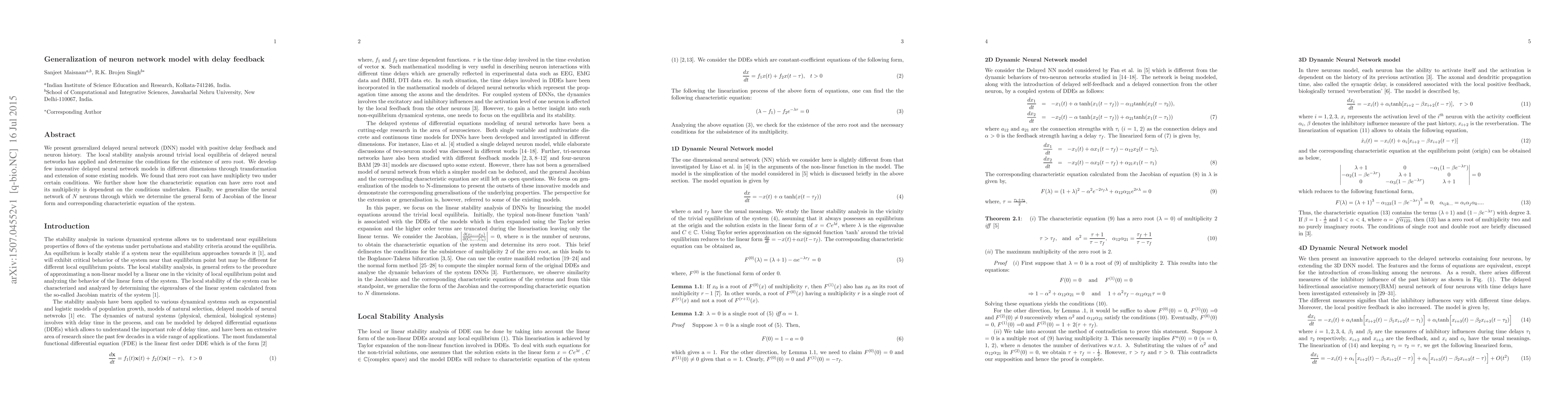 We present generalized delayed neural network (DNN) model with positive delay feedback and neuron history. The local stability analysis around trivial local equilibria of delayed neural networks has applied and determine the conditions for the existence of zero root. We develop few innovative delayed neural network models in different dimensions through transformation and extension of some existing models. We found that zero root can have multiplicity two under certain conditions. We further show how the characteristic equation can have zero root and its multiplicity is dependent on the conditions undertaken. Finally, we generalize the neural network of $N$ neurons through which we determine the general form of Jacobian of the linear form and corresponding characteristic equation of the system.