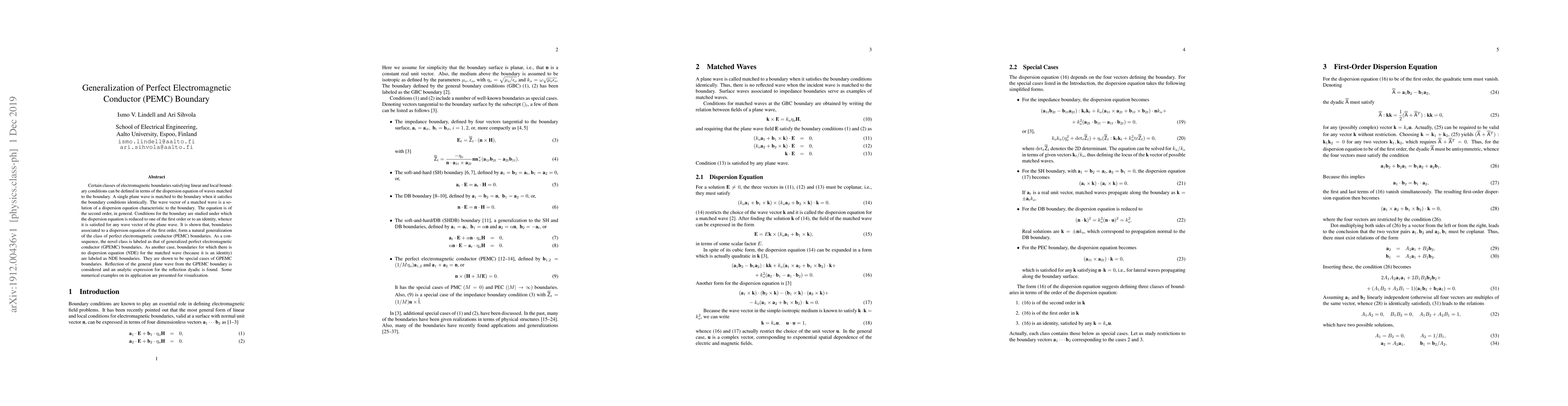 This paper generalizes the concept of perfect electromagnetic conductor (PEMC) boundaries by introducing generalized perfect electromagnetic conductor (GPEMC) boundaries, characterized by a first-order dispersion equation. It also defines non-dispersion equation (NDE) boundaries as special cases of GPEMC, and provides an analytic expression for the reflection dyadic from GPEMC boundaries with numerical examples.