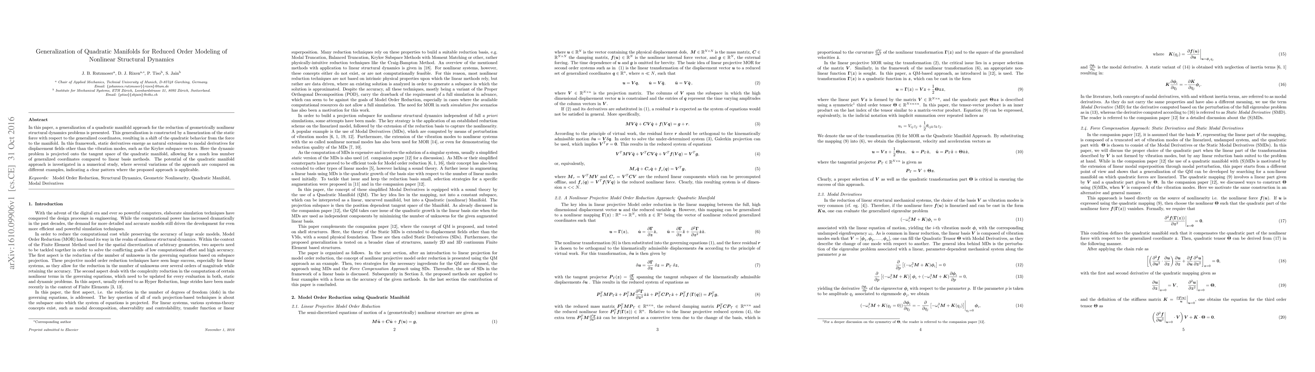 A new approach to reducing nonlinear structural dynamics problems uses a quadratic manifold, allowing for fewer generalized coordinates than traditional methods, and has been shown to be applicable in numerical studies.