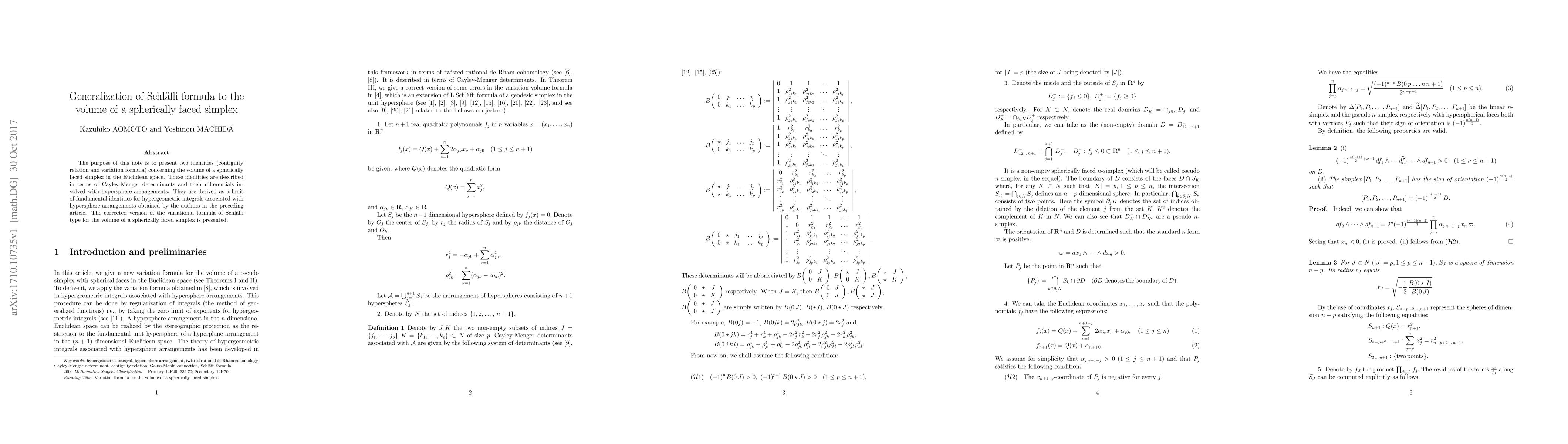 Summary: This paper generalizes the Schlafli formula to compute the volume of a spherically faced simplex using Cayley-Menger determinants and hypergeometric integrals, establishing two key identities through differentials and hypersphere arrangements.