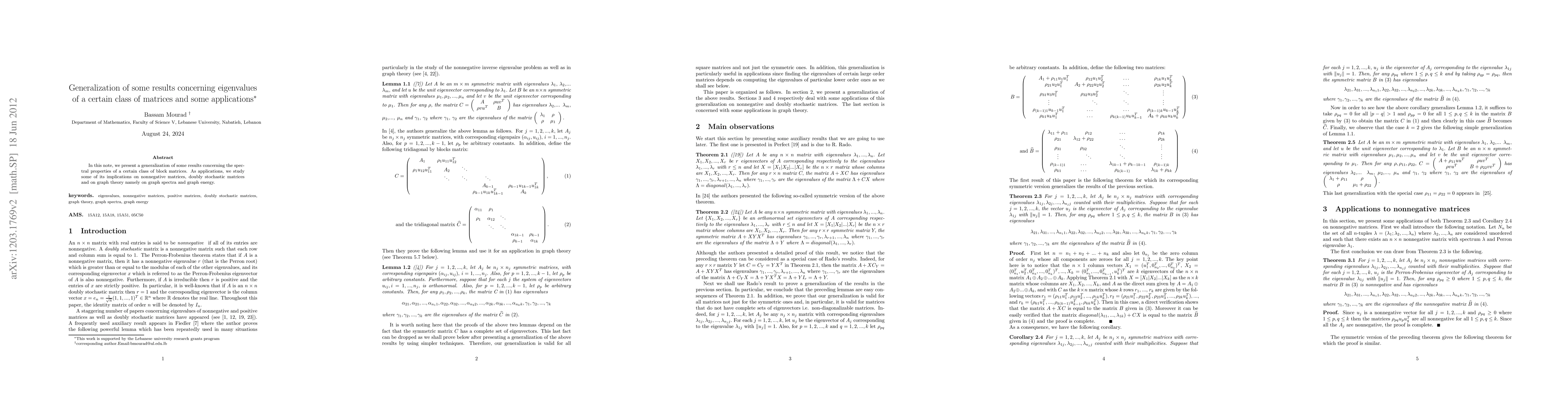 This paper generalizes results on the spectral properties of a specific class of block matrices and explores their implications for nonnegative matrices, doubly stochastic matrices, and graph theory, particularly focusing on graph spectra and graph energy.