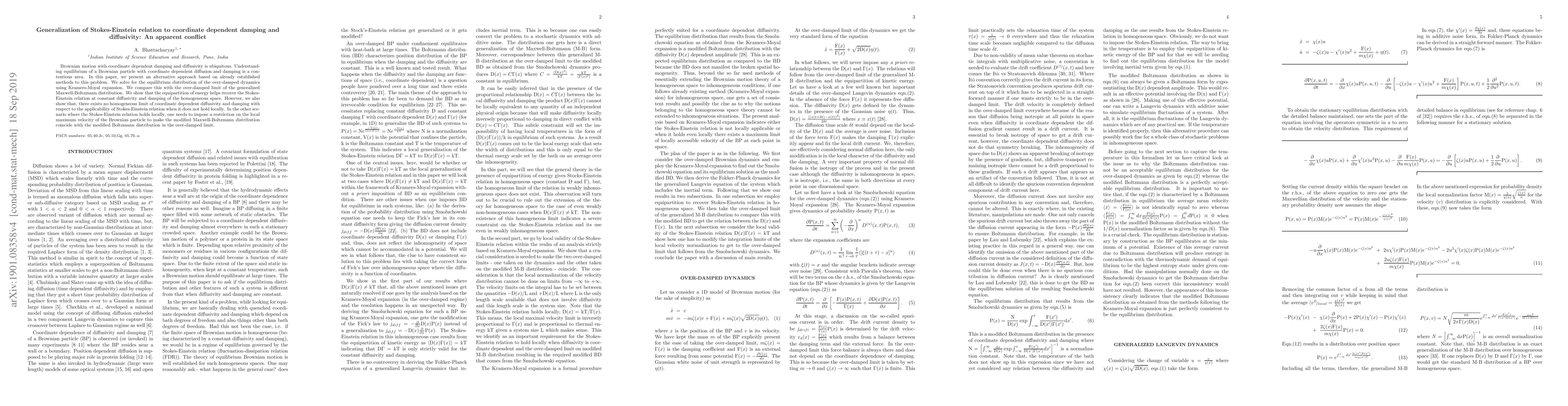 Brownian motion with coordinate dependent damping and diffusivity is ubiquitous. Understanding equilibrium of a Brownian particle with coordinate dependent diffusion and damping is a contentious area. In this paper, we present an alternative approach based on already established methods to this problem. We solve for the equilibrium distribution of the over-damped dynamics using Kramers-Moyal expansion. We compare this with the over-damped limit of the generalized Maxwell-Boltzmann distribution. We show that the equipartition of energy helps recover the Stokes-Einstein relation at constant diffusivity and damping of the homogeneous space. However, we also show that, there exists no homogeneous limit of coordinate dependent diffusivity and damping with respect to the applicability of Stokes-Einstein relation when it does not hold locally. In the other scenario where the Stokes-Einstein relation holds locally, one needs to impose a restriction on the local maximum velocity of the Brownian particle to make the modified Maxwell-Boltzmann distribution coincide with the modified Boltzmann distribution in the over-damped limit.