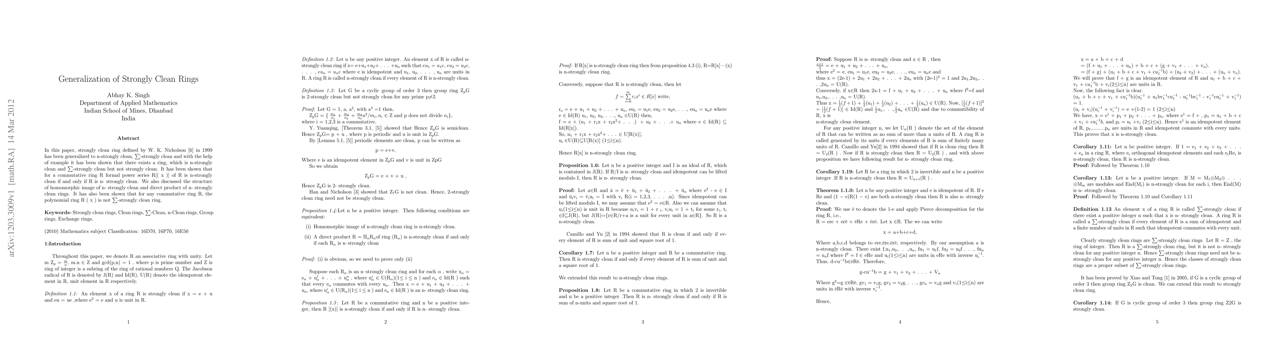 In this paper, strongly clean ring defined by W. K. Nicholson in 1999 has been generalized to n-strongly clean, {\Sigma}-strongly clean and with the help of example it has been shown that there exists a ring, which is n-strongly clean and {\Sigma}-strongly clean but not strongly clean. It has been shown that for a commutative ring R formal power series R[(x)] of R is n-strongly clean if and only if R is n- strongly clean. We also discussed the structure of homomorphic image of n- strongly clean and direct product of n- strongly clean rings. It has also been shown that for any commutative ring R, the polynomial ring R (x) is not {\Sigma}-strongly clean ring.