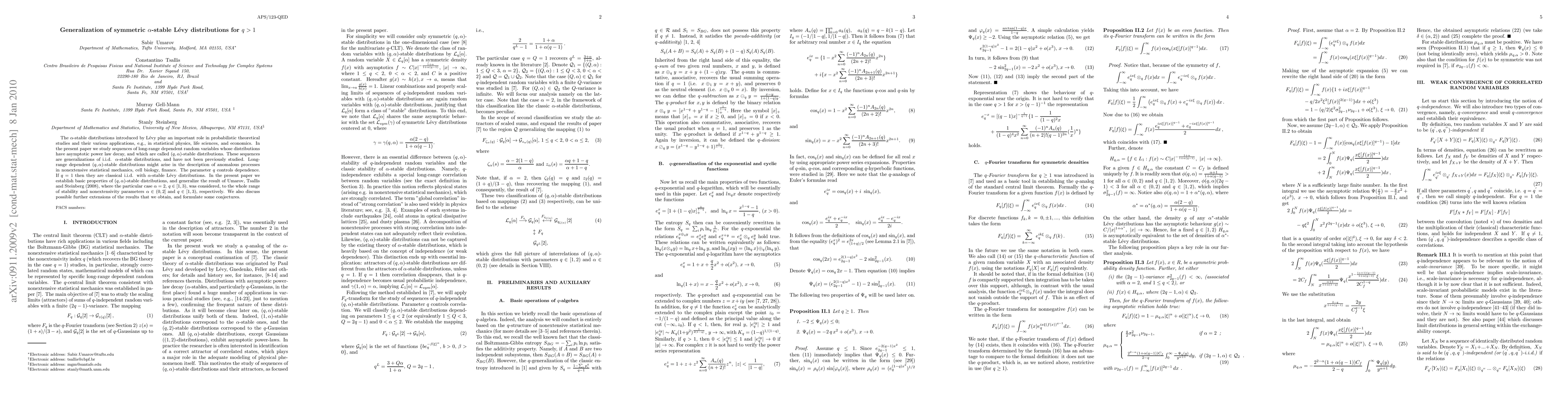 The $\alpha$-stable distributions introduced by L\'evy play an important role in probabilistic theoretical studies and their various applications, e.g., in statistical physics, life sciences, and economics. In the present paper we study sequences of long-range dependent random variables whose distributions have asymptotic power law decay, and which are called $(q,\alpha)$-stable distributions. These sequences are generalizations of i.i.d. $\alpha$-stable distributions, and have not been previously studied. Long-range dependent $(q,\alpha)$-stable distributions might arise in the description of anomalous processes in nonextensive statistical mechanics, cell biology, finance. The parameter $q$ controls dependence. If $q=1$ then they are classical i.i.d. with $\alpha$-stable L\'evy distributions. In the present paper we establish basic properties of $(q,\alpha)$-stable distributions, and generalize the result of Umarov, Tsallis and Steinberg (2008), where the particular case $\alpha=2, q\in [1,3),$ was considered, to the whole range of stability and nonextensivity parameters $\alpha \in (0,2]$ and $q \in [1,3),$ respectively. We also discuss possible further extensions of the results that we obtain, and formulate some conjectures.
