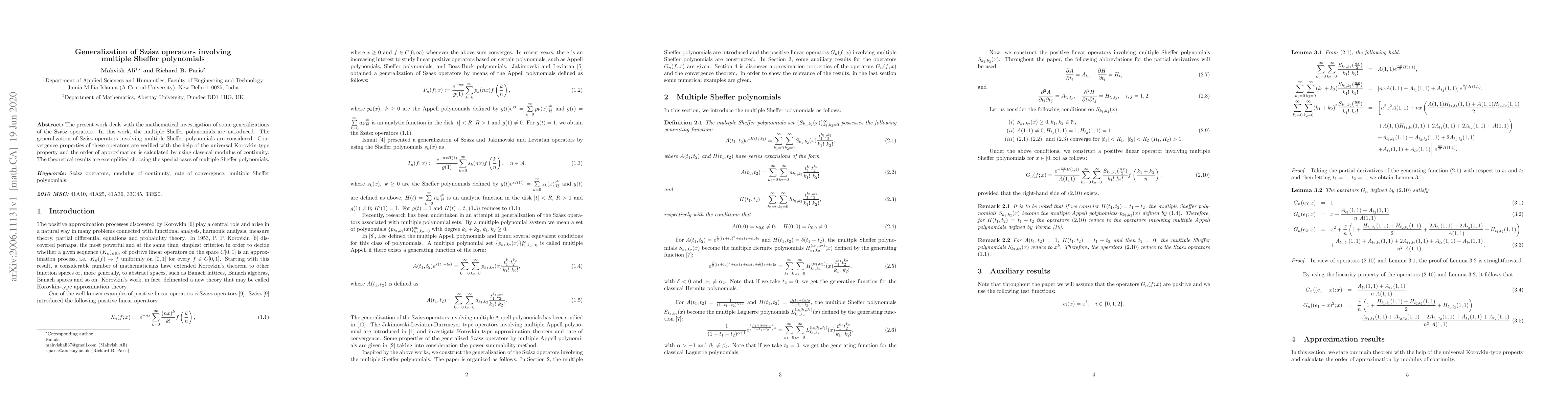 This paper generalizes Szász operators using multiple Sheffer polynomials, verifies their convergence through a universal Korovkin-type property, and calculates their order of approximation using the classical modulus of continuity, with special cases exemplifying the theoretical findings.