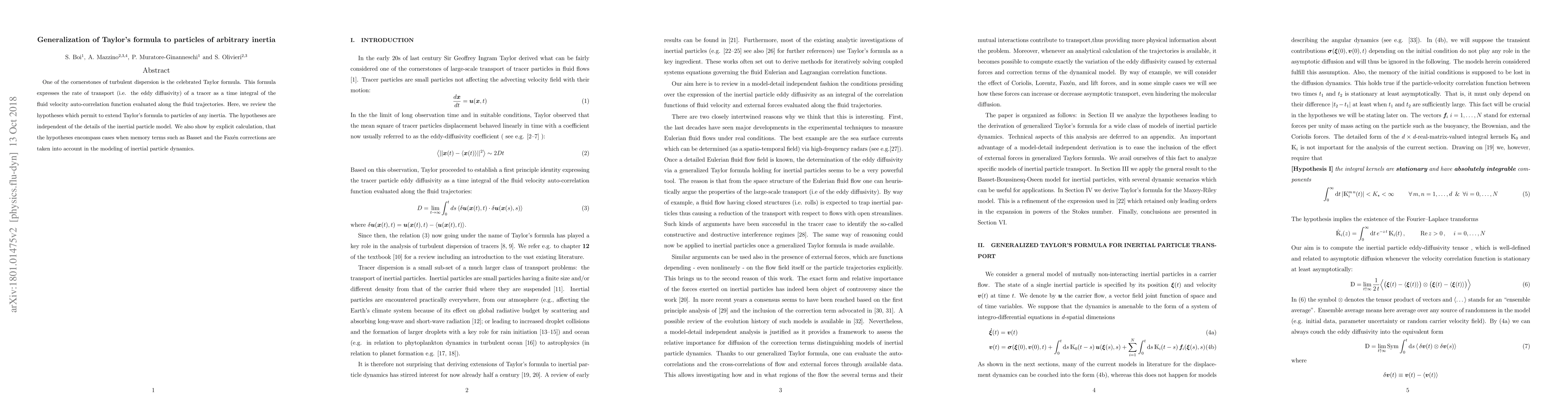 This paper generalizes Taylor's formula for turbulent dispersion to particles of arbitrary inertia, extending its applicability beyond passive tracers. The study identifies hypotheses that allow for the inclusion of memory terms like Basset and Faxén corrections in the modeling of inertial particle dynamics.
