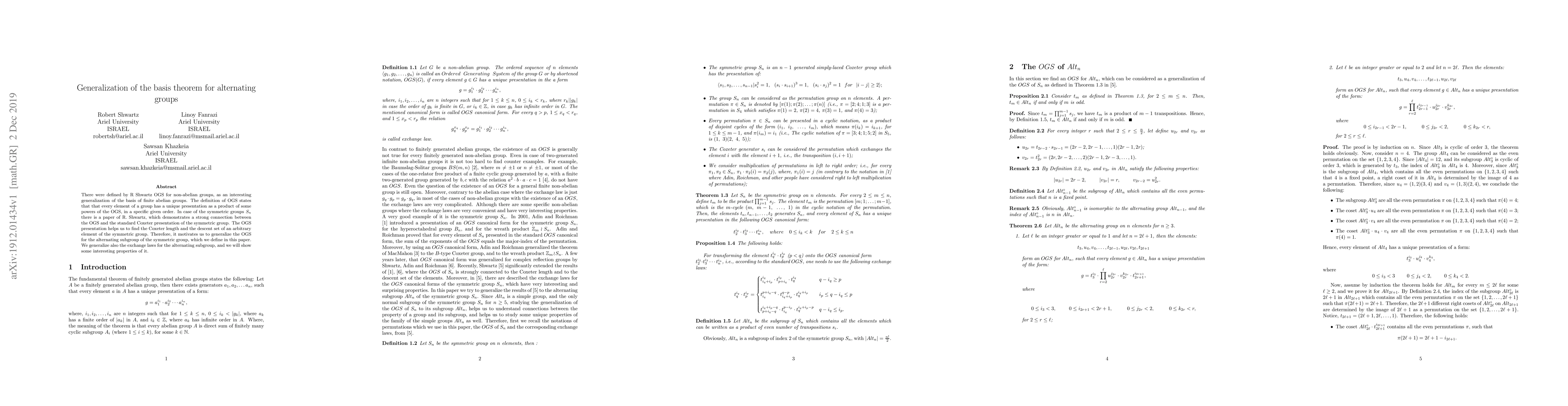 There were defined by R. Shwartz OGS for non-abelian groups, as an interesting generalization of the basis of finite abelian groups. The definition of OGS states that that every element of a group has a unique presentation as a product of some powers of the OGS, in a specific given order. In case of the symmetric groups S_{n} there is a paper of R. Shwartz, which demonstrates a strong connection between the OGS and the standard Coxeter presentation of the symmetric group. The OGS presentation helps us to find the Coxeter length and the descent set of an arbitrary element of the symmetric group. Therefore, it motivates us to generalize the OGS for the alternating subgroup of the symmetric group, which we define in this paper. We generalize also the exchange laws for the alternating subgroup, and we will show some interesting properties of it.