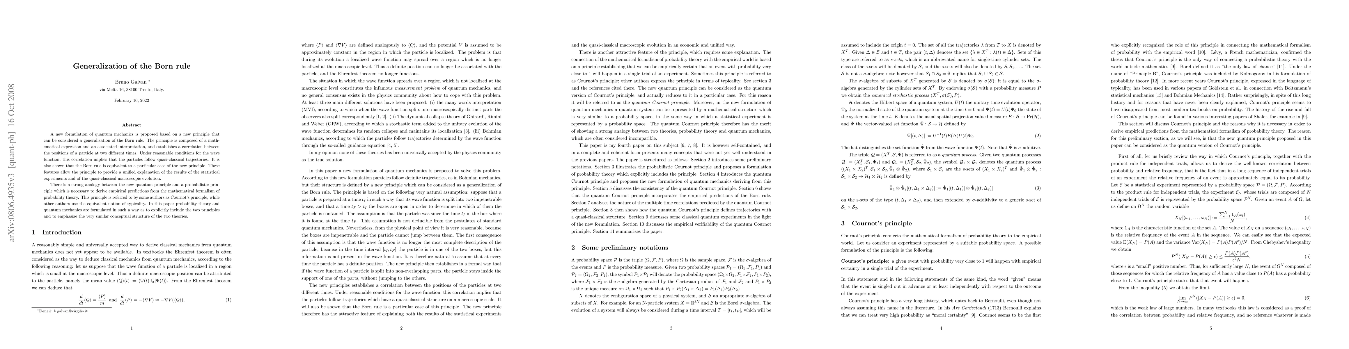 This paper proposes a new formulation of quantum mechanics that generalizes the Born rule, establishing a correlation between a particle's positions at different times that leads to quasi-classical trajectories. The new principle unifies quantum statistical experiments and macroscopic evolution, drawing parallels to Cournot's principle in probability theory.
