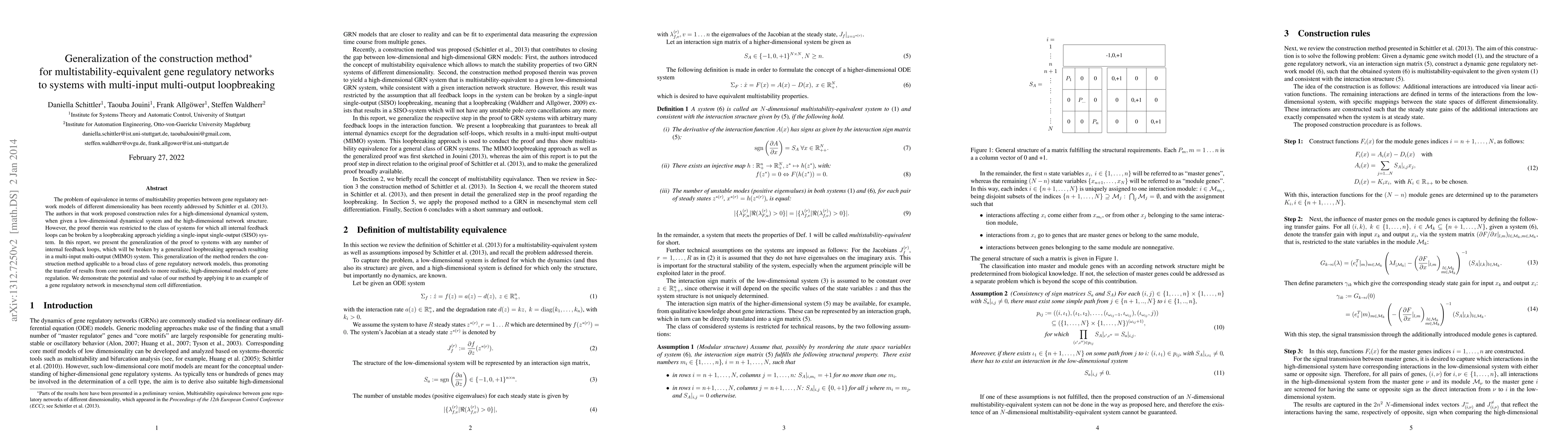 The problem of equivalence in terms of multistability properties between gene regulatory network models of different dimensionality has been recently addressed by Schittler et al. (2013). The authors in that work proposed construction rules for a high-dimensional dynamical system, when given a low-dimensional dynamical system and the high-dimensional network structure. However, the proof therein was restricted to the class of systems for which all internal feedback loops can be broken by a loopbreaking approach yielding a single-input single-output (SISO) system. In this report, we present the generalization of the proof to systems with any number of internal feedback loops, which will be broken by a generalized loopbreaking approach resulting in a multi-input multi-output (MIMO) system. This generalization of the method renders the construction method applicable to a broad class of gene regulatory network models, thus promoting the transfer of results from core motif models to more realistic, high-dimensional models of gene regulation. We demonstrate the potential and value of our method by applying it to an example of a gene regulatory network in mesenchymal stem cell differentiation.