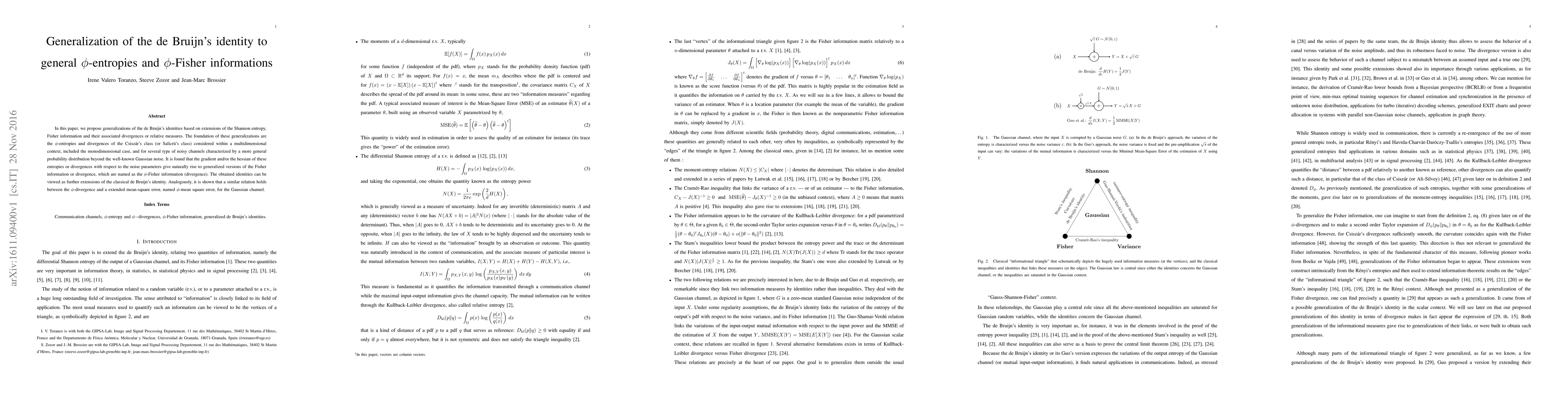 In this paper, we propose generalizations of the de Bruijn's identities based on extensions of the Shannon entropy, Fisher information and their associated divergences or relative measures. The foundation of these generalizations are the $\phi$-entropies and divergences of the Csisz\'a's class (or Salicr\'u's class) considered within a multidimensional context, included the monodimensional case, and for several type of noisy channels characterized by a more general probability distribution beyond the well-known Gaussian noise. It is found that the gradient and/or the hessian of these entropies or divergences with respect to the noise parameters give naturally rise to generalized versions of the Fisher information or divergence, which are named as the $\phi$-Fisher information (divergence). The obtained identities can be viewed as further extensions of the classical de Bruijn's identity. Analogously, it is shown that a similar relation holds between the $\phi$-divergence and a extended mean-square error, named $\phi$-mean square error, for the Gaussian channel.