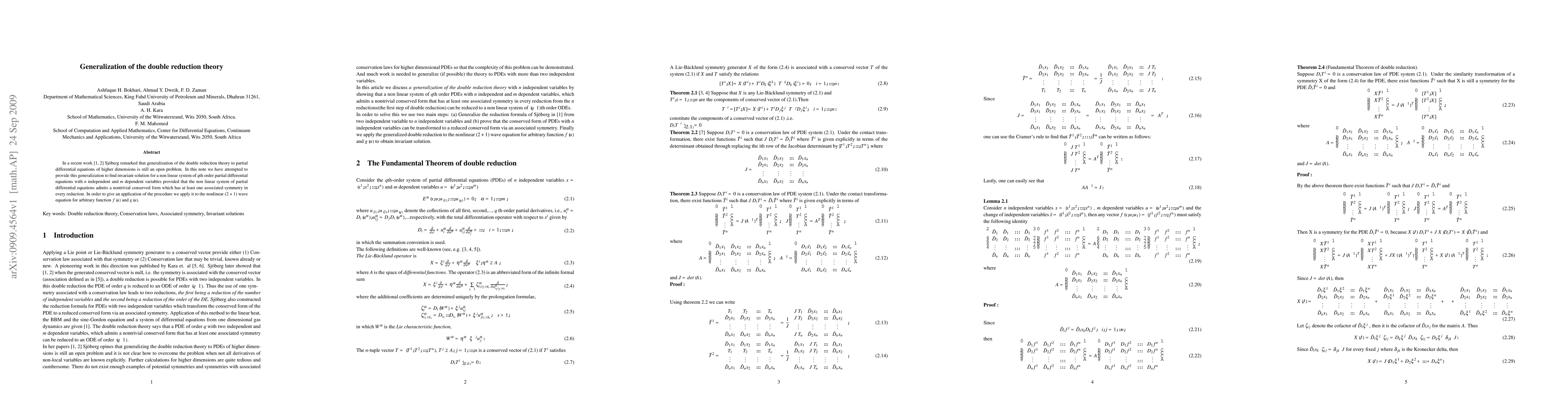 In a recent work [1, 2] Sjoberg remarked that generalization of the double reduction theory to partial differential equations of higher dimensions is still an open problem. In this note we have attempted to provide this generalization to find invariant solution for a non linear system of qth order partial differential equations with n independent and m dependent variables provided that the non linear system of partial differential equations admits a nontrivial conserved form which has at least one associated symmetry in every reduction. In order to give an application of the procedure we apply it to the nonlinear (2 + 1) wave equation for arbitrary function f (u) and g(u).
