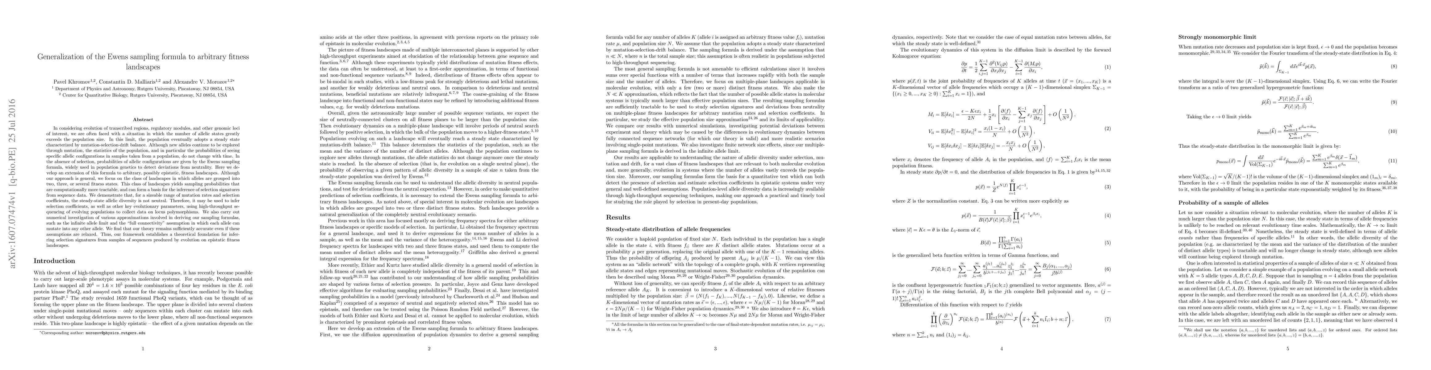 In considering evolution of transcribed regions, regulatory modules, and other genomic loci of interest, we are often faced with a situation in which the number of allelic states greatly exceeds the population size. In this limit, the population eventually adopts a steady state characterized by mutation-selection-drift balance. Although new alleles continue to be explored through mutation, the statistics of the population, and in particular the probabilities of seeing specific allelic configurations in samples taken from a population, do not change with time. In the absence of selection, probabilities of allelic configurations are given by the Ewens sampling formula, widely used in population genetics to detect deviations from neutrality. Here we develop an extension of this formula to arbitrary, possibly epistatic, fitness landscapes. Although our approach is general, we focus on the class of landscapes in which alleles are grouped into two, three, or several fitness states. This class of landscapes yields sampling probabilities that are computationally more tractable, and can form a basis for the inference of selection signatures from sequence data. We demonstrate that, for a sizeable range of mutation rates and selection coefficients, the steady-state allelic diversity is not neutral. Therefore, it may be used to infer selection coefficients, as well as other key evolutionary parameters, using high-throughput sequencing of evolving populations to collect data on locus polymorphisms. We also find that our theory remains sufficiently accurate even if the assumptions such as the infinite allele limit and the "full connectivity" assumption in which each allele can mutate into any other allele are relaxed. Thus, our framework establishes a theoretical foundation for inferring selection signatures from samples of sequences produced by evolution on epistatic fitness landscapes.