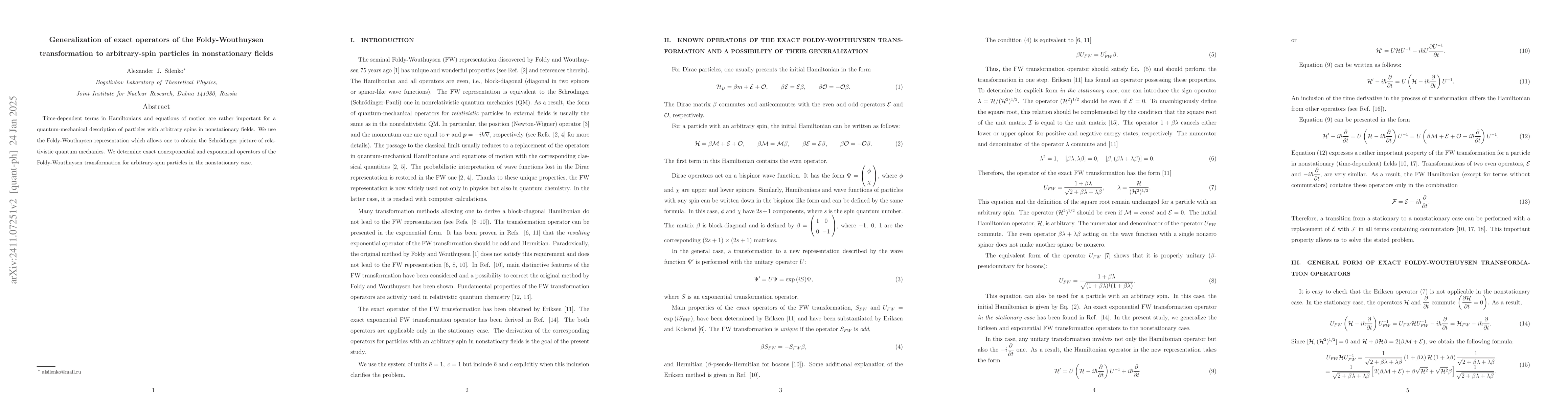 Time-dependent terms in Hamiltonians and equations of motion can be rather important for a quantum-mechanical description of a particle in nonstationary fields. We use the Foldy-Wouthuysen transformation which allows one to obtain the Schr\"{o}dinger picture of relativistic quantum mechanics. We consider particles with arbitrary spins in nonstationary fields. Unlike previous publications, we determine exact Eriksen and exponential operators of the Foldy-Wouthuysen transformation in this general case.