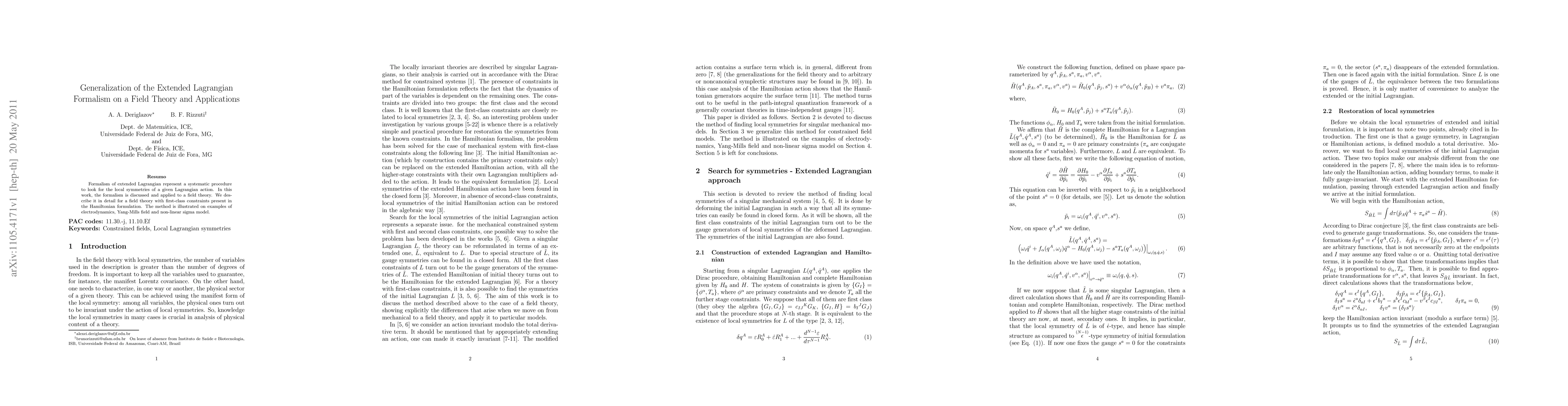 This paper generalizes the extended Lagrangian formalism to field theory, focusing on first-class constraints in the Hamiltonian framework. It applies this method to electrodynamics, Yang-Mills field, and non-linear sigma models to demonstrate its utility.