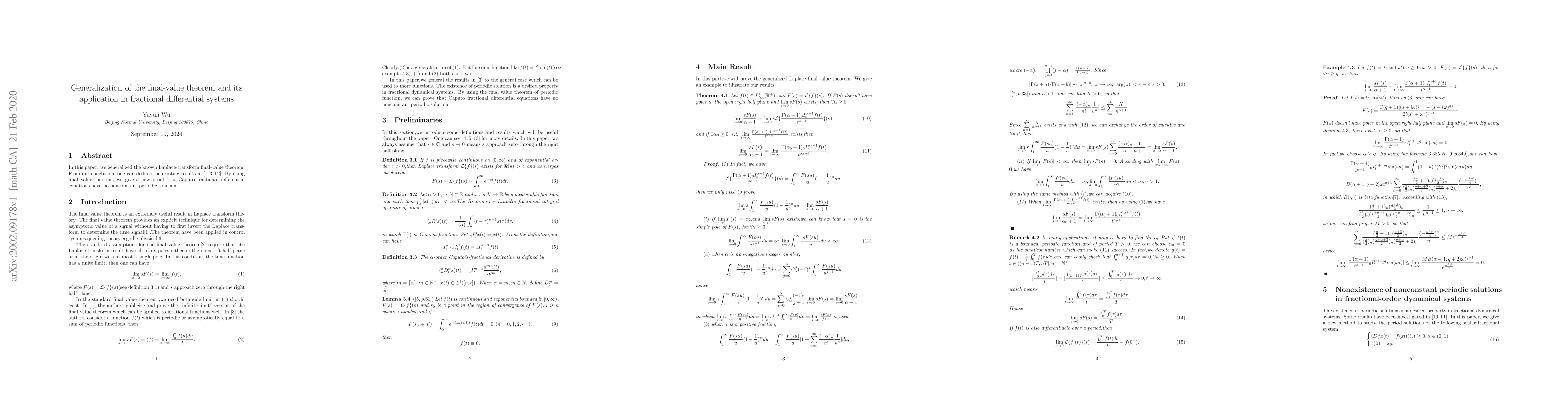 In this paper, we generalized the known Laplace-transform final-value theorem. From our conclusion, one can deduce the existing results in [1, 3, 12]. By using final value theorem, we give a new proof that Caputo fractional differential equations have no nonconstant periodic solution.