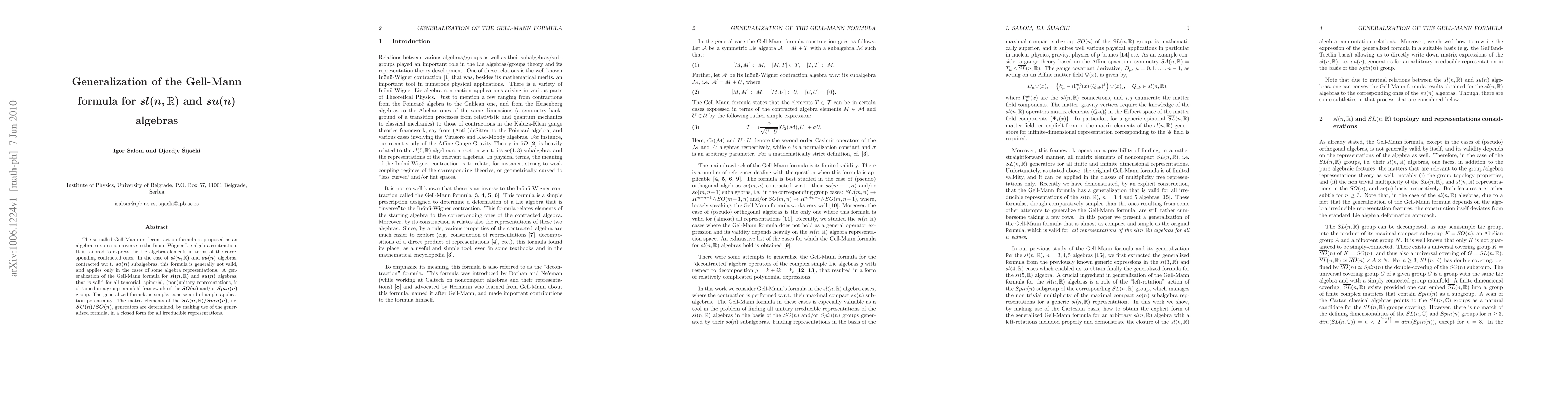 The so called Gell-Mann or decontraction formula is proposed as an algebraic expression inverse to the Inonu-Wigner Lie algebra contraction. It is tailored to express the Lie algebra elements in terms of the corresponding contracted ones. In the case of sl(n,R) and su(n) algebras, contracted w.r.t. so(n) subalgebras, this formula is generally not valid, and applies only in the cases of some algebra representations. A generalization of the Gell-Mann formula for sl(n,R) and su(n) algebras, that is valid for all tensorial, spinorial, (non)unitary representations, is obtained in a group manifold framework of the SO(n) and/or Spin(n) group. The generalized formula is simple, concise and of ample application potentiality. The matrix elements of the SL(n,R)/Spin(n), i.e. SU(n)/SO(n), generators are determined, by making use of the generalized formula, in a closed form for all irreducible representations.