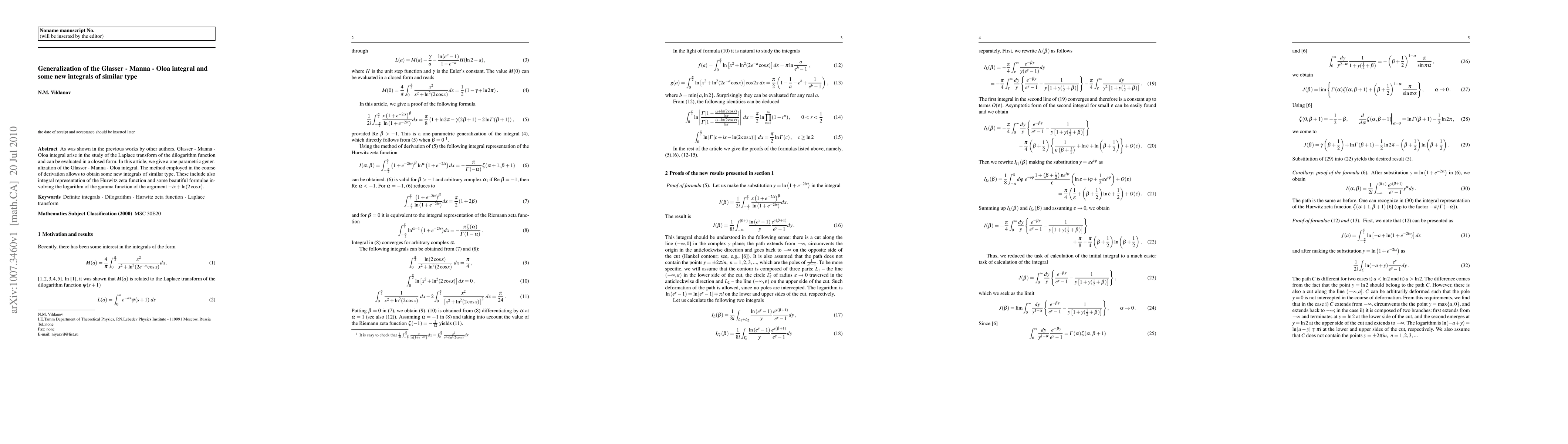 As was shown in the previous works by other authors, Glasser - Manna - Oloa integral arise in the study of the Laplace transform of the dilogarithm function and can be evaluated in a closed form. In this article, we give a one parametric generalization of the Glasser - Manna - Oloa integral. The method employed in the course of derivation allows to obtain some new integrals of similar type. These include also integral representation of the Hurwitz zeta function and some beautiful formulae involving the logarithm of the gamma function of the argument -ix+ln(2cosx).