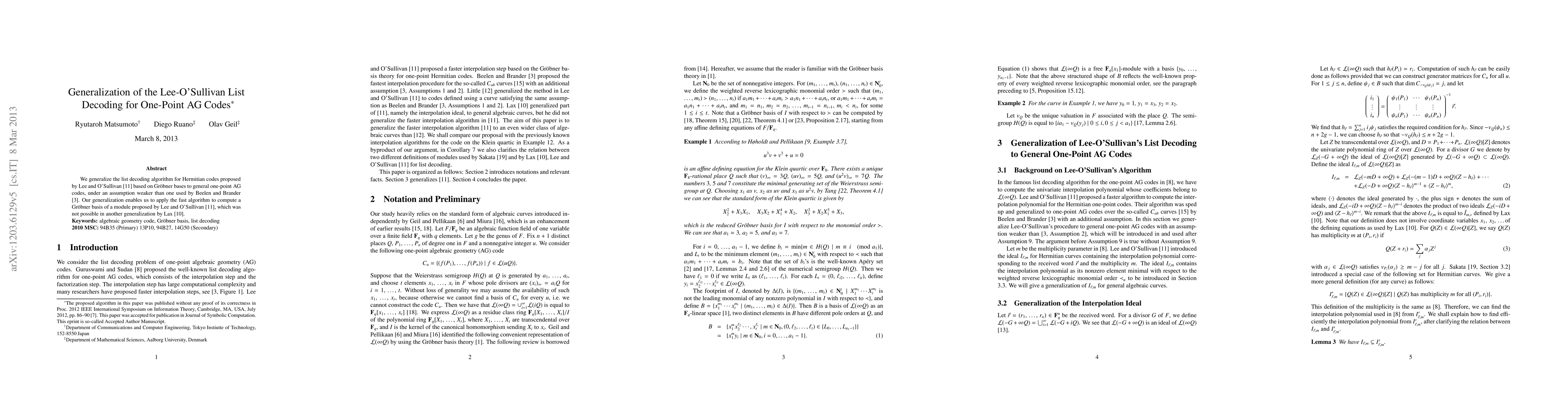 This paper generalizes the Lee-O'Sullivan list decoding algorithm for Hermitian codes to one-point AG codes, using a weaker assumption than previous work. This generalization allows the application of a fast algorithm for computing Gröbner bases, overcoming limitations in prior generalizations.