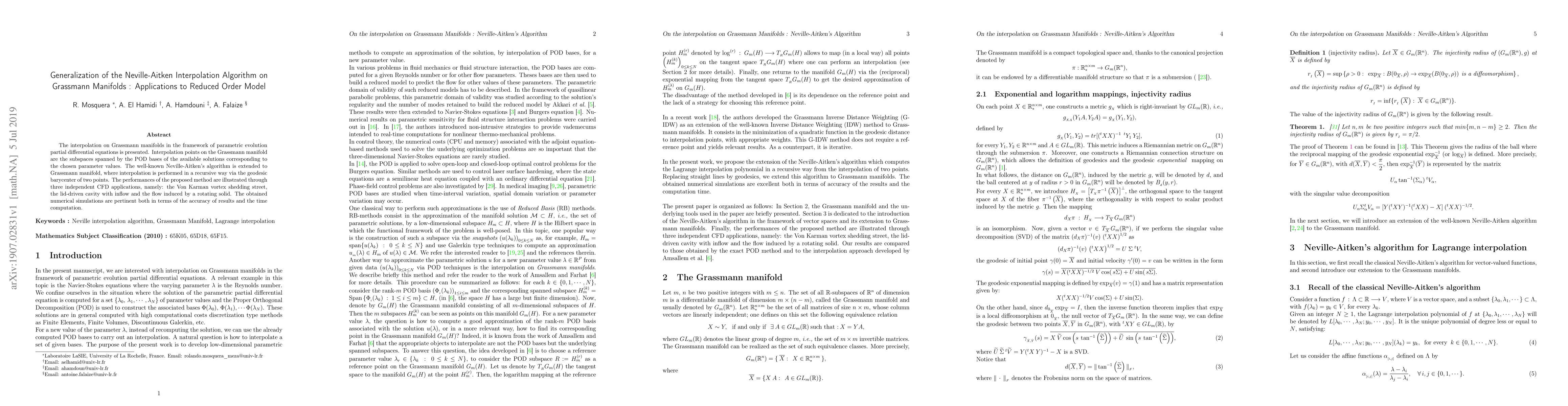 The interpolation on Grassmann manifolds in the framework of parametric evolution partial differential equations is presented. Interpolation points on the Grassmann manifold are the subspaces spanned by the POD bases of the available solutions corresponding to the chosen parameter values. The well-known Neville-Aitken's algorithm is extended to Grassmann manifold, where interpolation is performed in a recursive way via the geodesic barycenter of two points. The performances of the proposed method are illustrated through three independent CFD applications, namely: the Von Karman vortex shedding street, the lid-driven cavity with inflow and the flow induced by a rotating solid. The obtained numerical simulations are pertinent both in terms of the accuracy of results and the time computation.