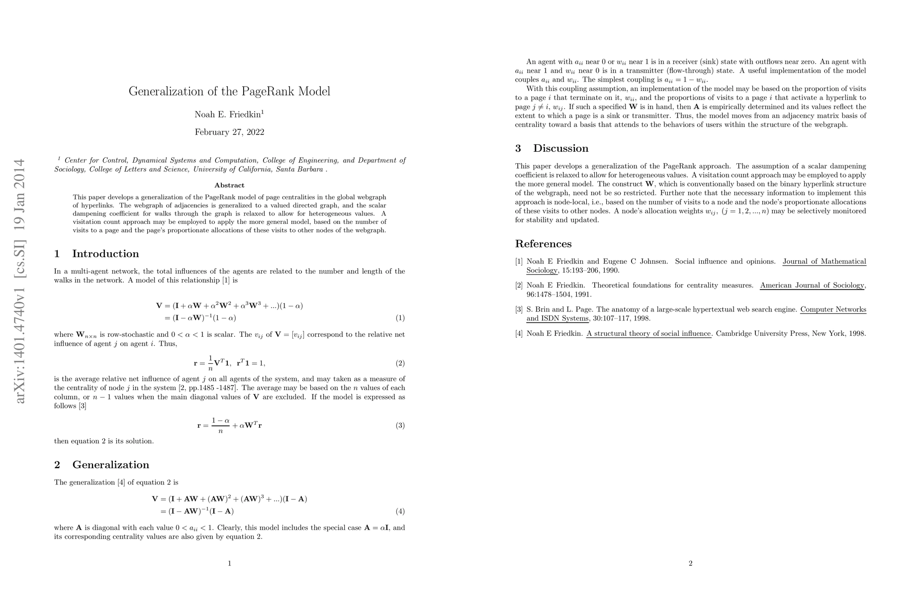 This paper develops a generalization of the PageRank model of page centralities in the global webgraph of hyperlinks. The webgraph of adjacencies is generalized to a valued directed graph, and the scalar dampening coefficient for walks through the graph is relaxed to allow for heterogeneous values. A visitation count approach may be employed to apply the more general model, based on the number of visits to a page and the page's proportionate allocations of these visits to other nodes of the webgraph.