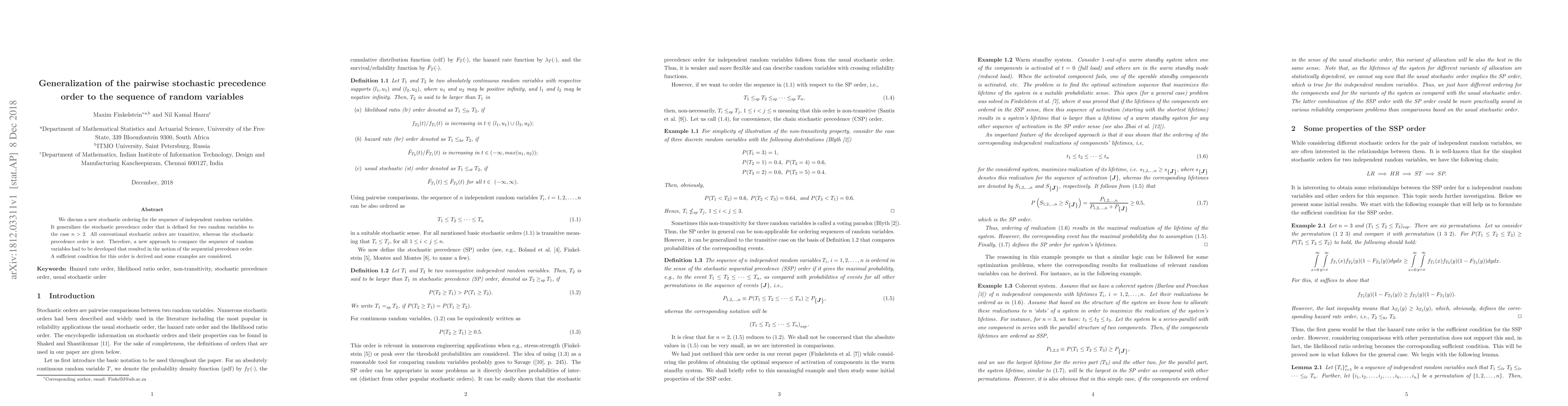 We discuss a new stochastic ordering for the sequence of independent random variables. It generalizes the stochastic precedence order that is defined for two random variables to the case $n>2$. All conventional stochastic orders are transitive, whereas the stochastic precedence order is not. Therefore, a new approach to compare the sequence of random variables had to be developed that resulted in the notion of the sequential precedence order. A sufficient condition for this order is derived and some examples are considered.