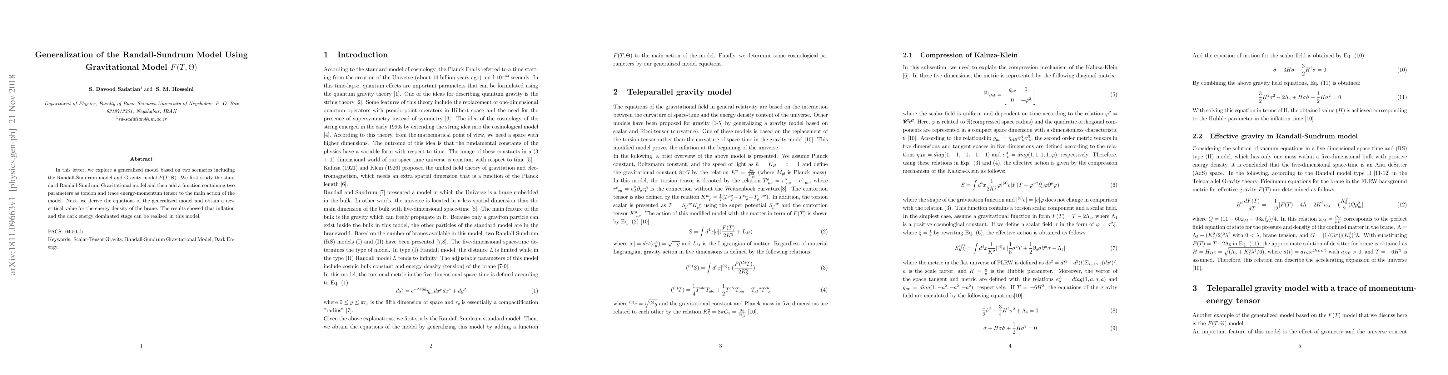 In this letter, we explore a generalized model based on two scenarios including the Randall-Sundrum model and Gravity model $F(T,\Theta)$. We first study the standard Randall-Sundrum Gravitational model and then add a function containing two parameters as torsion and trace energy-momentum tensor to the main action of the model. Next, we derive the equations of the generalized model and obtain a new critical value for the energy density of the brane. The results showed that inflation and the dark energy dominated stage can be realized in this model.