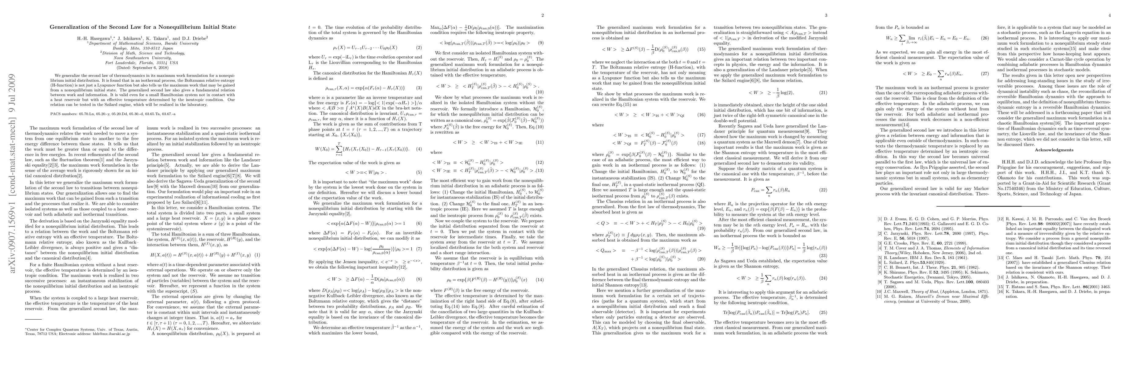 This paper generalizes the second law of thermodynamics for nonequilibrium initial states, showing that the Boltzmann relative entropy determines maximum work gain in isothermal processes. It establishes a fundamental link between work and information, applicable even to small systems without a heat reservoir, and proposes experimental verification using the Szilard engine.
