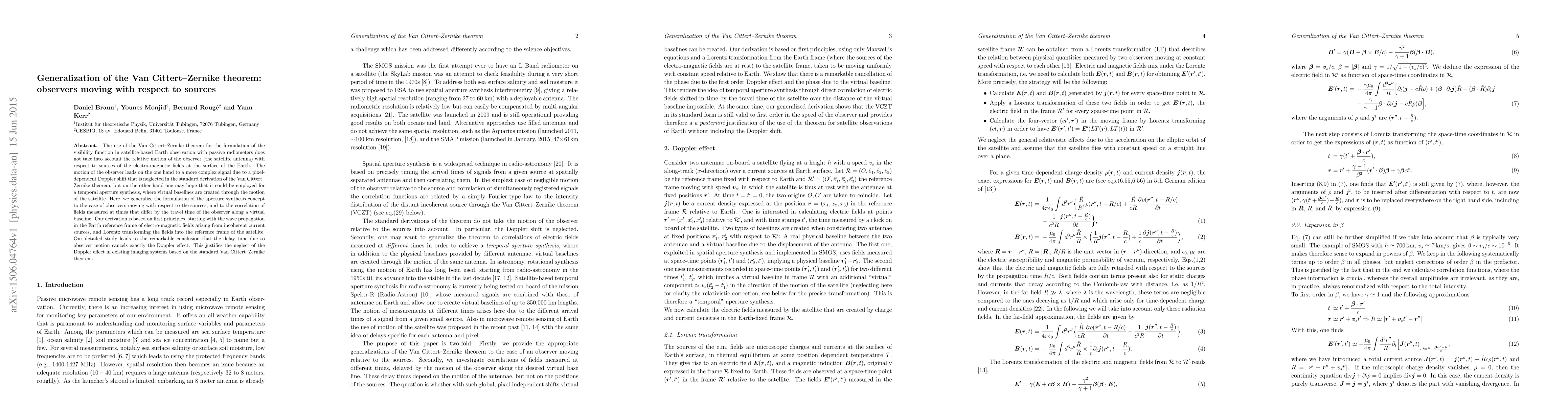 This paper generalizes the Van Cittert--Zernike theorem to account for the relative motion between satellite-based observers and terrestrial electromagnetic field sources. It reveals that the observer's motion cancels the Doppler effect, justifying the standard theorem's use in satellite imaging despite relative motion.