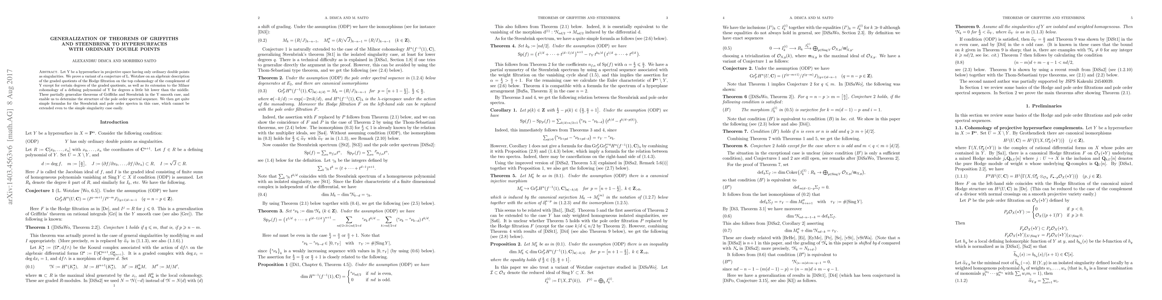 This paper generalizes theorems of Griffiths and Steenbrink for hypersurfaces in projective space with only ordinary double points, proving a conjecture of L. Wotzlaw regarding the algebraic description of graded quotients of the Hodge filtration on the cohomology of the complement, and the Milnor cohomology of the defining polynomial.
