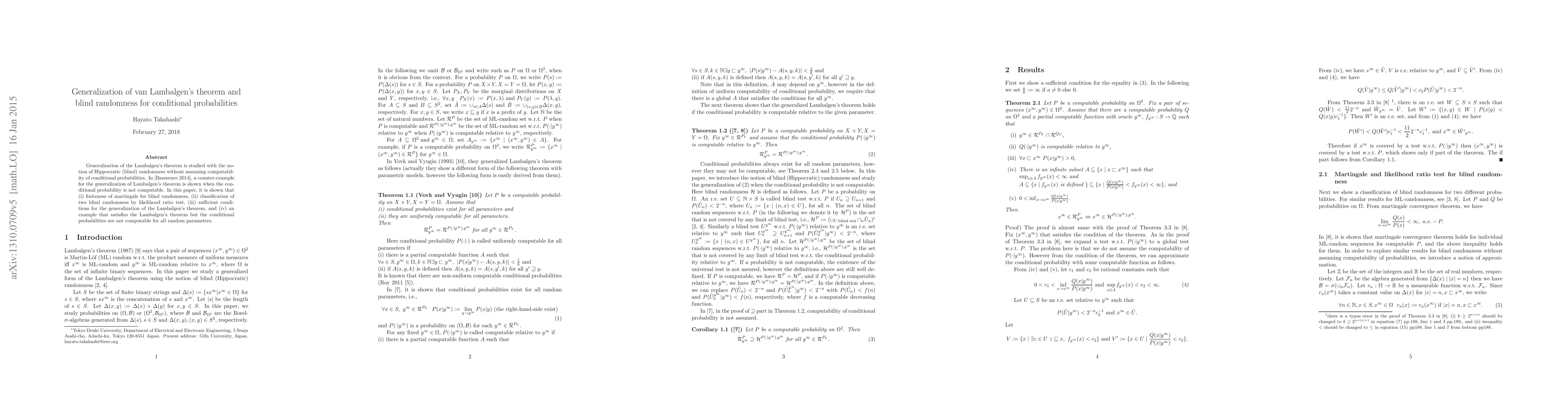 This paper generalizes van Lambalgen's theorem using Hippocratic (blind) randomness, demonstrating finiteness of martingale, classification via likelihood ratio test, and sufficient conditions for the theorem's generalization, while also providing an example where the theorem holds but conditional probabilities are not computable.