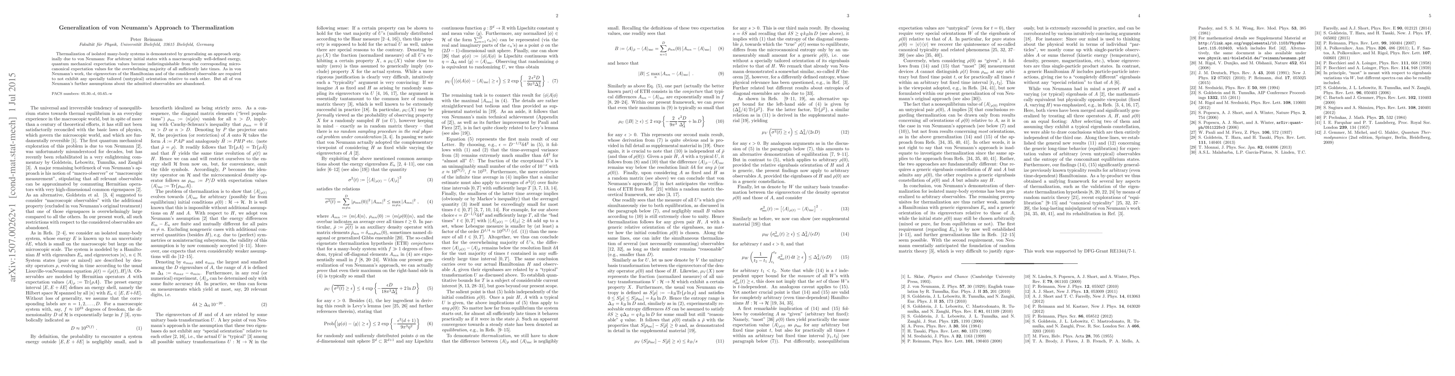 This paper generalizes von Neumann's approach to thermalization, showing that for systems with a well-defined macroscopic energy, quantum mechanical expectation values converge to microcanonical values over time, provided the eigenvectors of the Hamiltonian and observables lack special orientations. Unlike von Neumann, it does not impose restrictions on the types of observables considered.