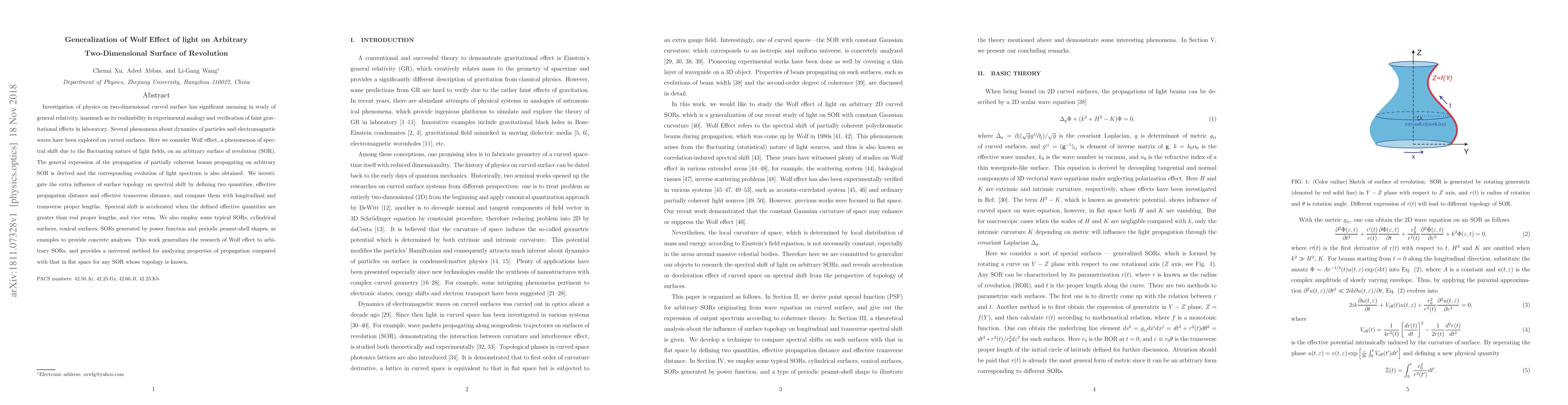 This paper generalizes the Wolf Effect, a spectral shift phenomenon due to fluctuating light fields, on arbitrary two-dimensional surfaces of revolution. It derives a general expression for partially coherent beam propagation and investigates the influence of surface topology on spectral shift, providing a universal method for analyzing light propagation properties on such surfaces.