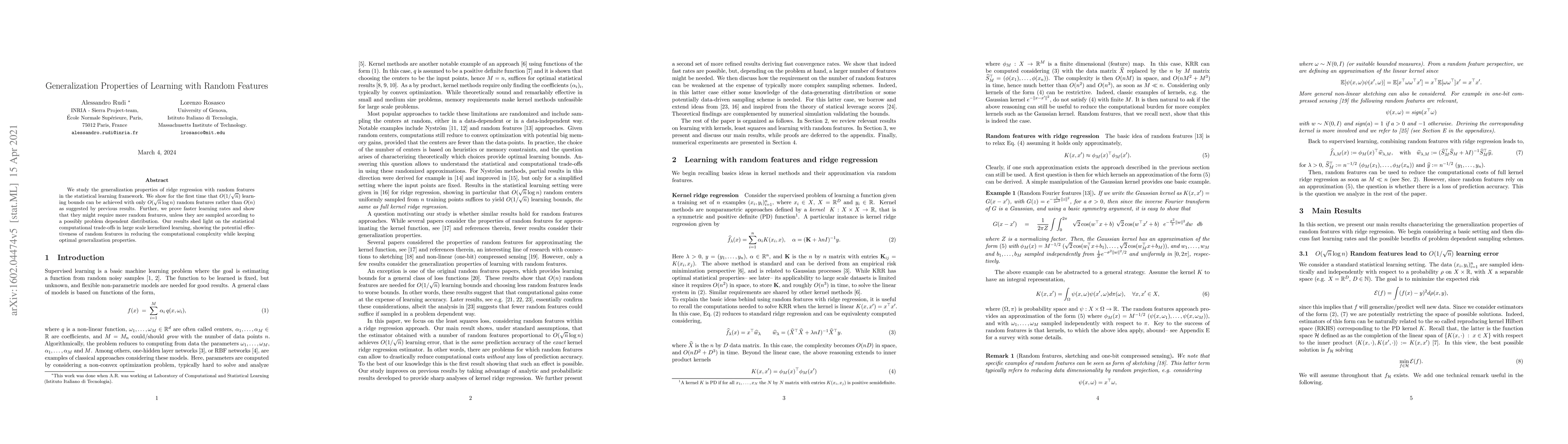 This paper demonstrates that ridge regression with random features can achieve $O(1/\sqrt{n})$ learning bounds using only $O(\sqrt{n}\log n)$ features, significantly fewer than previous $O(n)$ requirements. It also explores the statistical computational trade-offs in kernelized learning, highlighting the effectiveness of random features in reducing complexity while maintaining optimal generalization.
