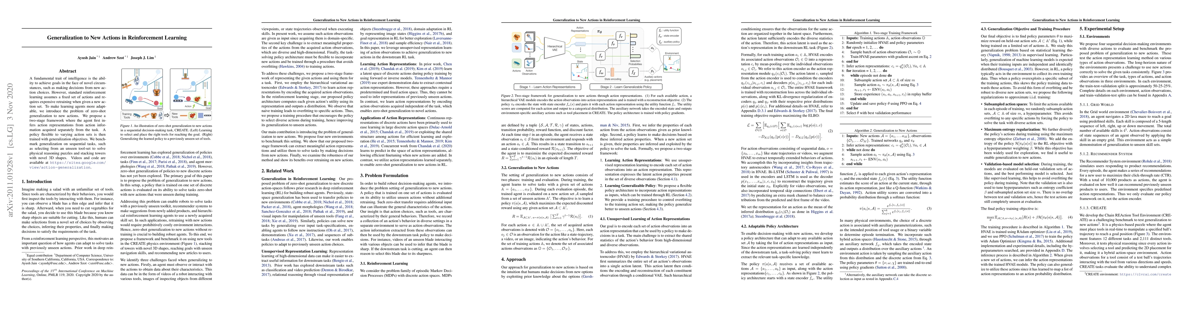 Researchers propose a two-stage framework to enable reinforcement learning agents to adapt to new actions without requiring retraining. They demonstrate successful generalization to novel action sets in sequential tasks such as tool selection and tower stacking.