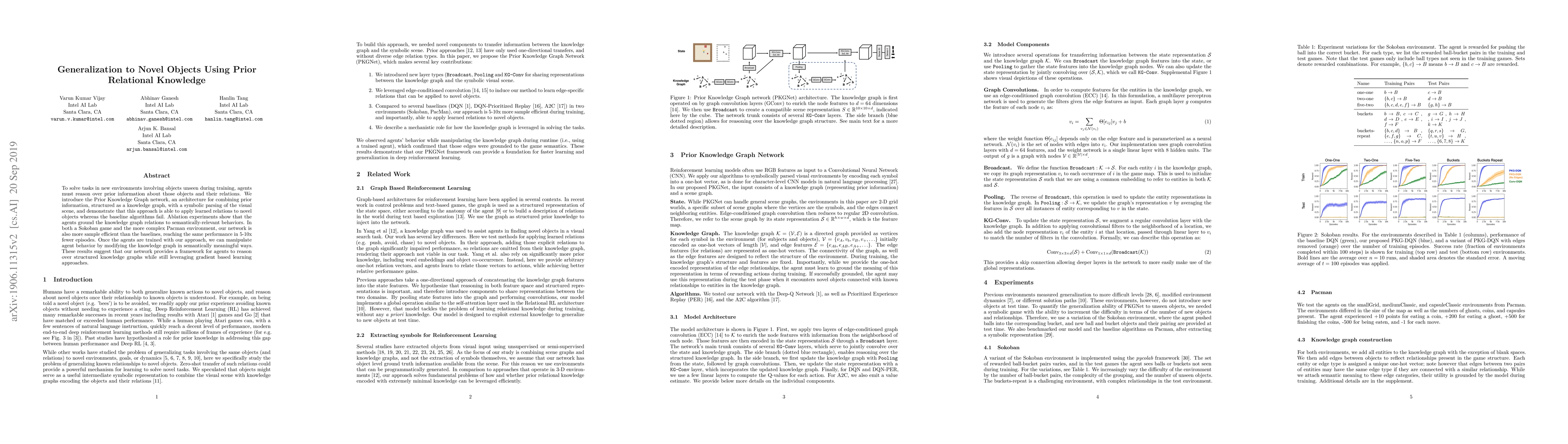To solve tasks in new environments involving objects unseen during training, agents must reason over prior information about those objects and their relations. We introduce the Prior Knowledge Graph network, an architecture for combining prior information, structured as a knowledge graph, with a symbolic parsing of the visual scene, and demonstrate that this approach is able to apply learned relations to novel objects whereas the baseline algorithms fail. Ablation experiments show that the agents ground the knowledge graph relations to semantically-relevant behaviors. In both a Sokoban game and the more complex Pacman environment, our network is also more sample efficient than the baselines, reaching the same performance in 5-10x fewer episodes. Once the agents are trained with our approach, we can manipulate agent behavior by modifying the knowledge graph in semantically meaningful ways. These results suggest that our network provides a framework for agents to reason over structured knowledge graphs while still leveraging gradient based learning approaches.