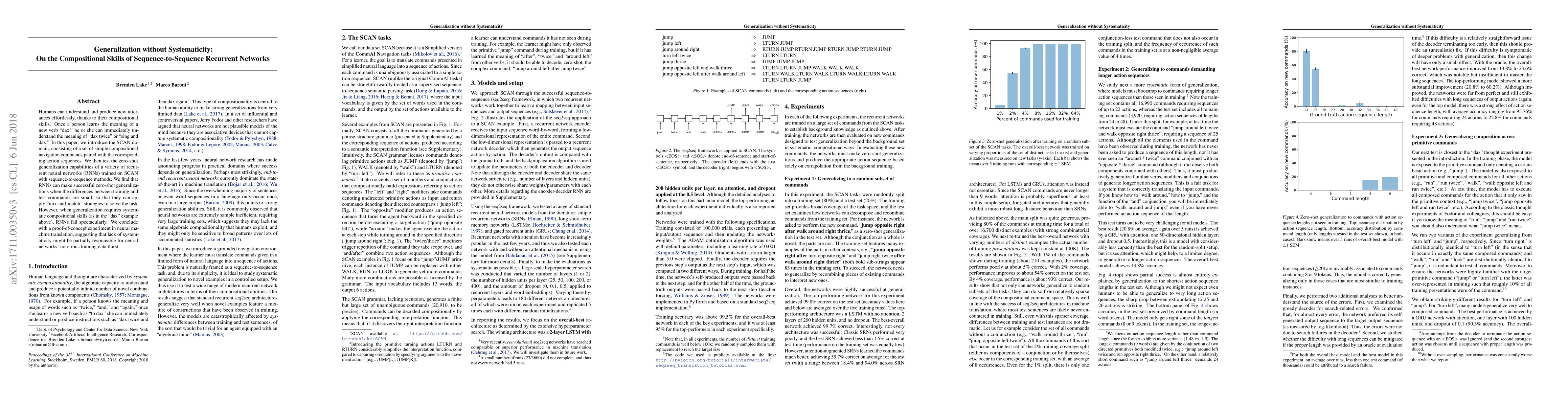 This paper investigates the compositional skills of sequence-to-sequence RNNs using the SCAN domain, finding they can generalize well for minor variations but fail on systematic compositional tasks like understanding "dax twice." It suggests that lack of systematicity may contribute to neural networks' need for extensive training data.