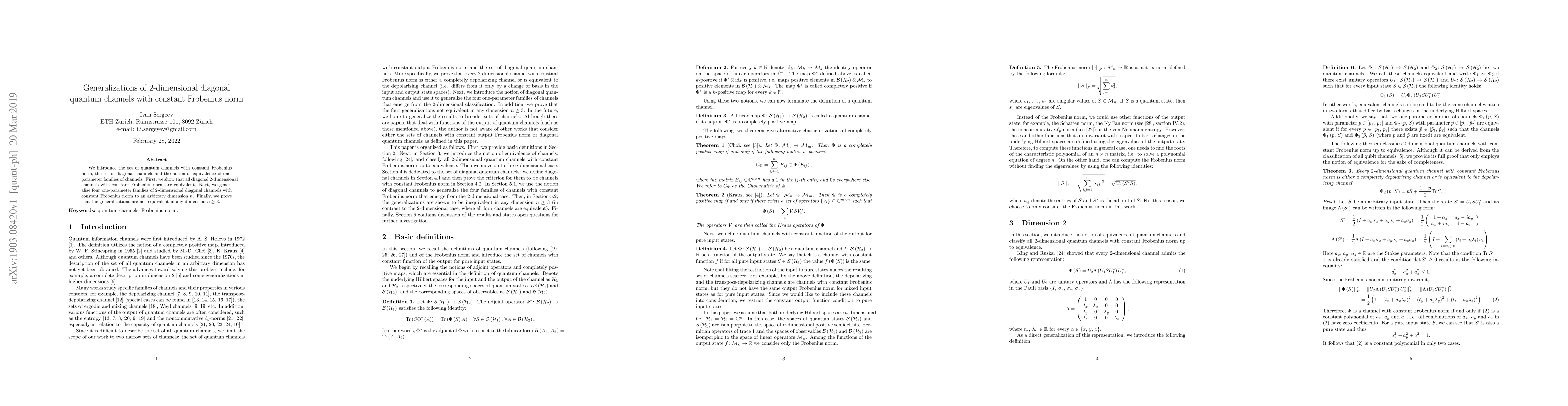 We introduce the set of quantum channels with constant Frobenius norm, the set of diagonal channels and the notion of equivalence of one-parameter families of channels. First, we show that all diagonal $2$-dimensional channels with constant Frobenius norm are equivalent. Next, we generalize four one-parameter families of $2$-dimensional diagonal channels with constant Frobenius norm to an arbitrary dimension $n$. Finally, we prove that the generalizations are not equivalent in any dimension $n \ge 3$.