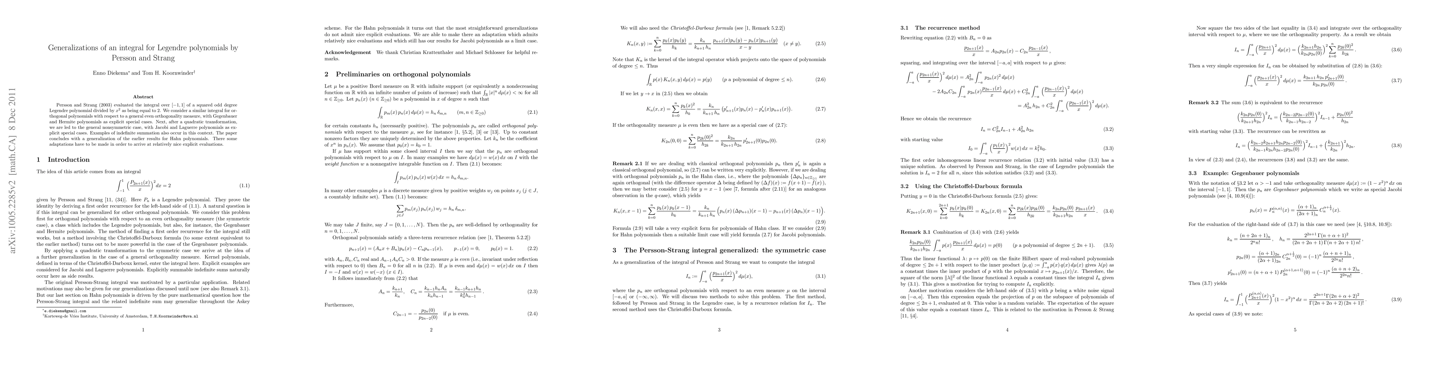 Persson and Strang's integral involving squared odd degree Legendre polynomials is generalized for orthogonal polynomials under various measures, including Gegenbauer, Hermite, Jacobi, and Laguerre polynomials. The study also extends to Hahn polynomials with necessary adaptations for explicit evaluations.