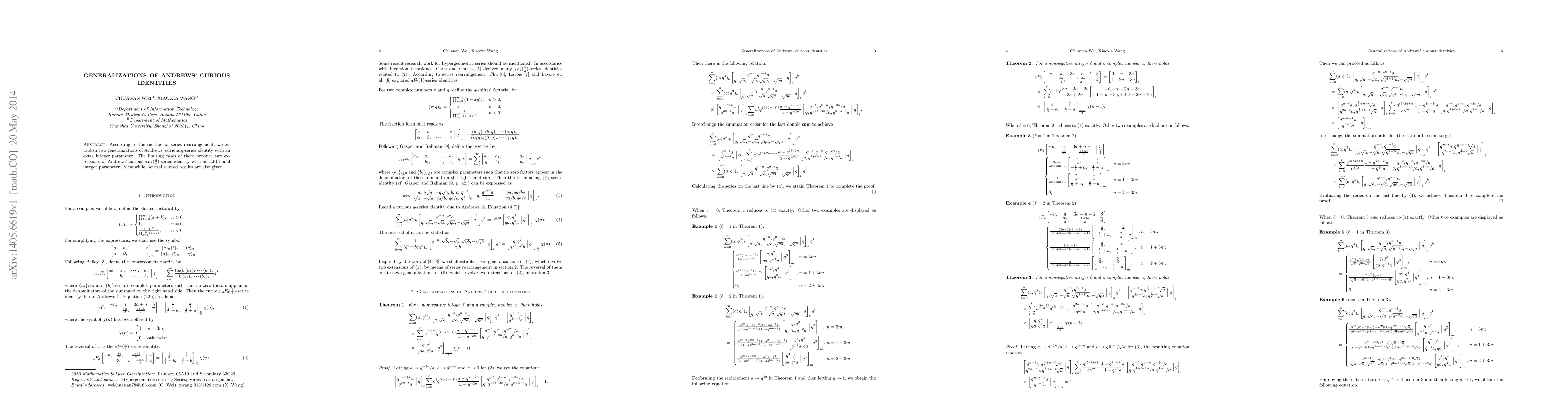 According to the method of series rearrangement, we establish two generalizations of Andrews' curious $q$-series identity with an extra integer parameter. The limiting cases of them produce two extensions of Andrews' curious $_3F_2(\frac{3}{4})$-series identity with an additional integer parameter. Meanwhile, several related results are also given.