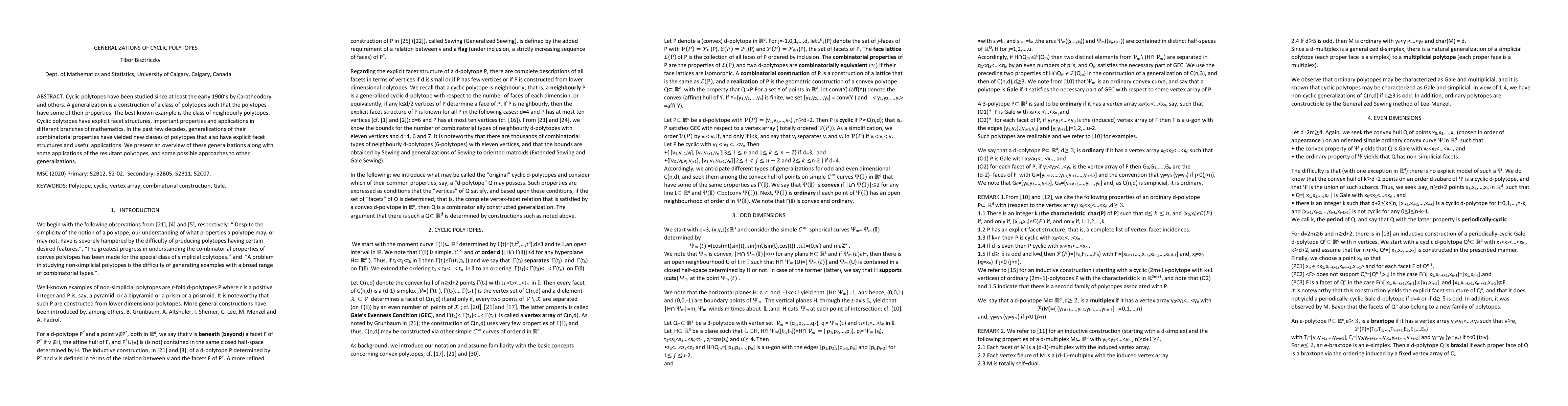 This paper provides an overview of generalizations of cyclic polytopes, focusing on their combinatorial properties and applications. It discusses new classes of polytopes, such as neighbourly polytopes, and explores potential future directions for further generalizations.