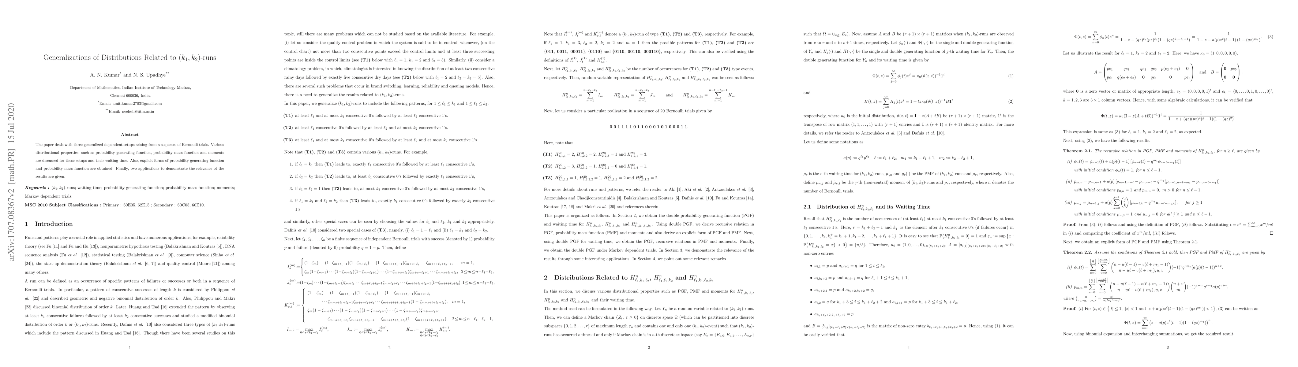 The paper deals with three generalized dependent setups arising from a sequence of Bernoulli trials. Various distributional properties, such as probability generating function, probability mass function and moments are discussed for these setups and their waiting time. Also, explicit forms of probability generating function and probability mass function are obtained. Finally, two applications to demonstrate the relevance of the results are given.