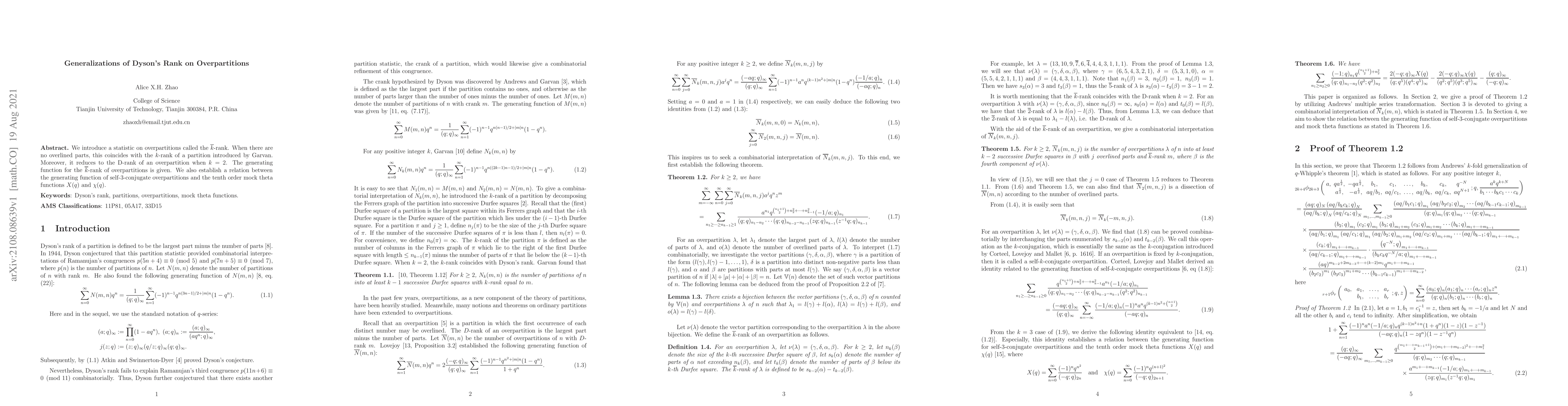 This paper introduces a new statistic called the $\overline{k}$-rank on overpartitions, which generalizes Garvan's $k$-rank and reduces to the D-rank when $k=2$. It provides the generating function for this $\overline{k}$-rank and links it to tenth order mock theta functions.