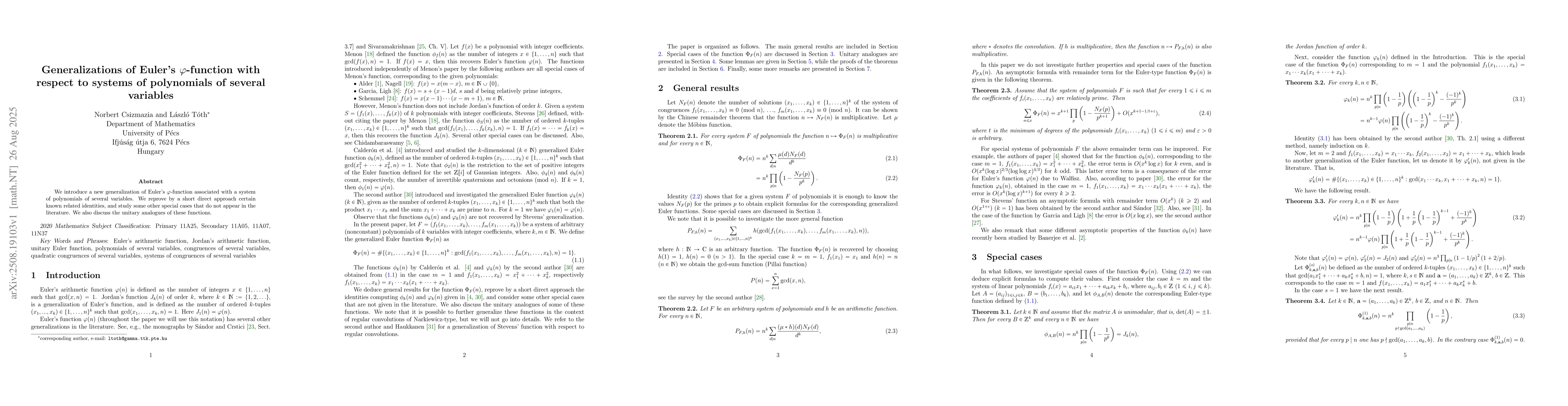 We introduce a new generalization of Euler's $\varphi$-function associated with a system of polynomials of several variables. We reprove by a short direct approach certain known related identities, and study some other special cases that do not appear in the literature. We also discuss the unitary analogues of these functions.