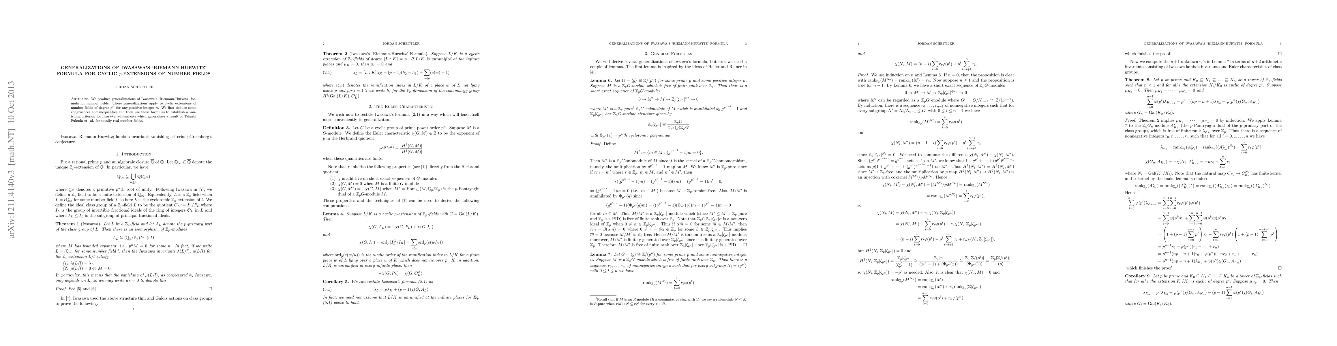 We produce generalizations of Iwasawa's `Riemann-Hurwitz' formula for number fields. These generalizations apply to cyclic extensions of number fields of degree p^n for any positive integer n. We first deduce some congruences and inequalities and then use these formulas to establish a vanishing criterion for Iwasawa \lambda-invariants which generalizes a result of Takashi Fukuda et. al. for totally real number fields.