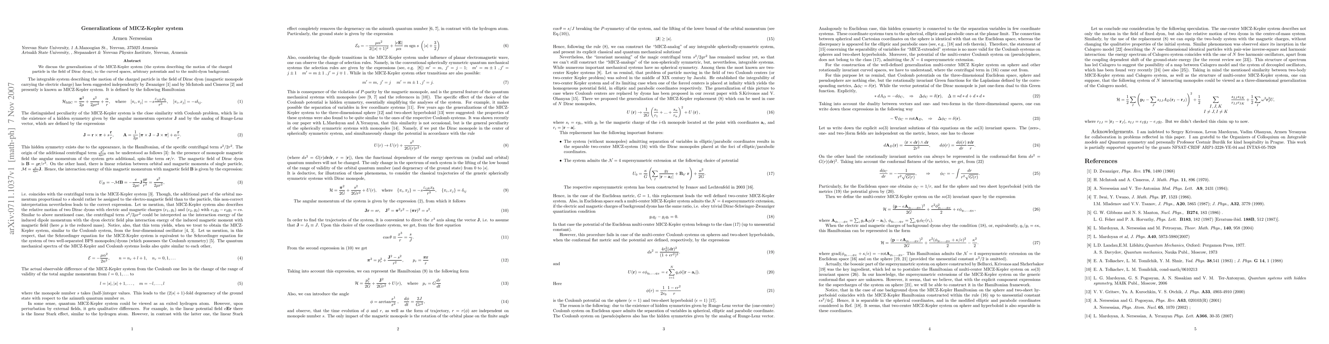 We discuss the generalizations of the MICZ-Kepler system (the system describing the motion of the charged particle in the field of Dirac dyon), to the curved spaces, arbitrary potentials and to the multi-dyon background.