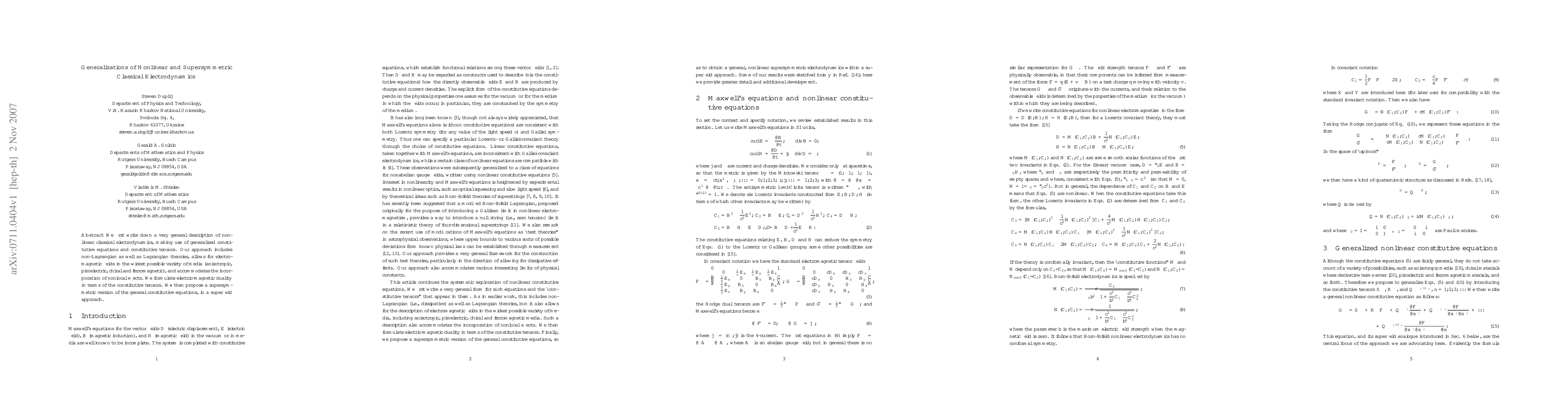 This paper generalizes nonlinear classical electrodynamics using generalized constitutive equations and tensors, encompassing a wide range of media and effects. It also introduces a supersymmetric version of these equations through a superfield approach, formulating electric-magnetic duality within this framework.