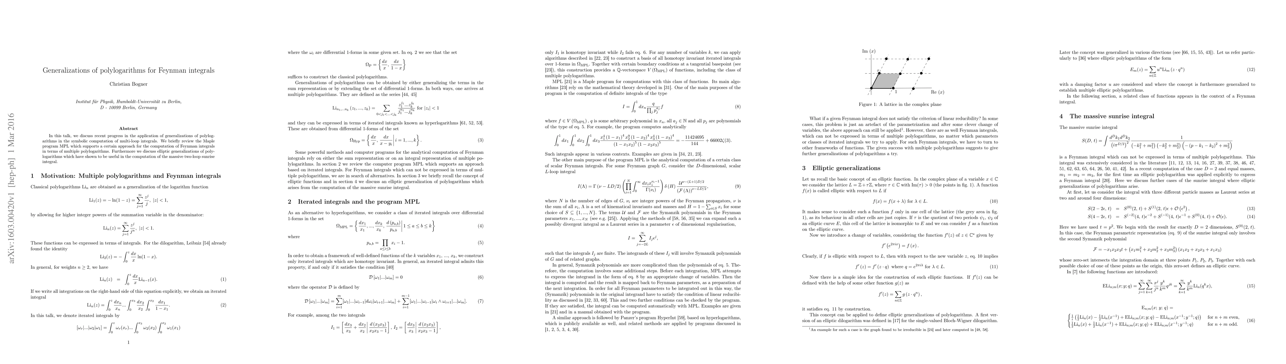 This paper explores advancements in using generalized polylogarithms for computing multi-loop Feynman integrals, reviewing the Maple program MPL and introducing elliptic generalizations effective for the massive two-loop sunrise integral.